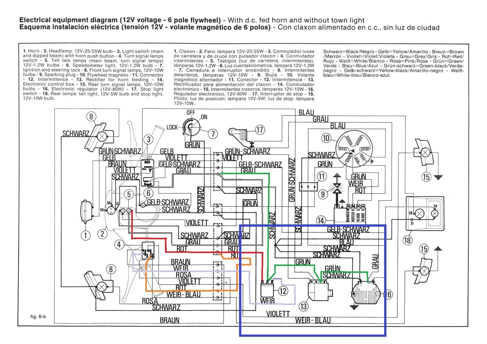 Wenn ich ein Wechselstromnetz habe, scheidet nicht dann der Hupengleichrichter, an dem das Blinkrelais mit dem grünen Kabel hängt, als Fehlerquelle aus, weil grün vom Spannungsregler kommend nur durchgeschleift wird?
