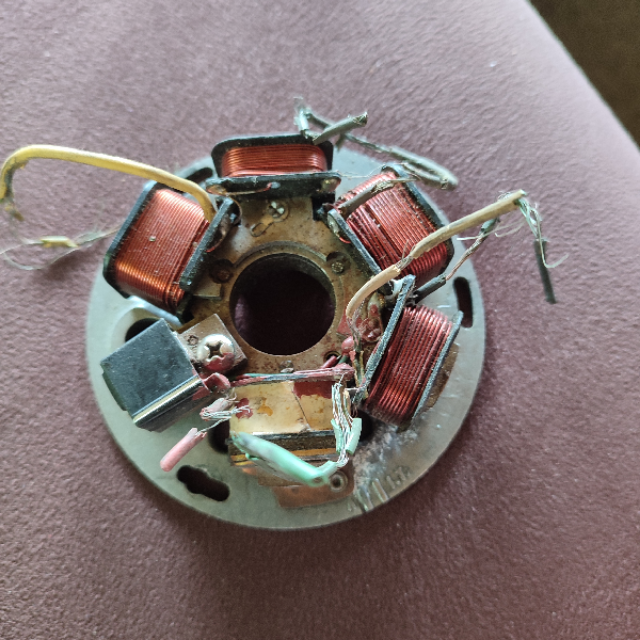 Von oben sieht man das schwarze viereckige Teil, daran ist das rote Kabel, links davon auf der Spule ist das gelbe Kabel dran. rechts von dem schwarzen Teil wurde das grüne angebracht . welche Farben muß ich nun der Reihenfolge nach anlöten ? Ich kann leider leinerlei Farben mehr erkennen. Kann mir jemand dabei helfen , wie ich rechts herum gegen den Uhrzeiger anlöten muß, oder hat jemand eine Spule so dqss ich es anhand einem Bild bearbeiten kann ?