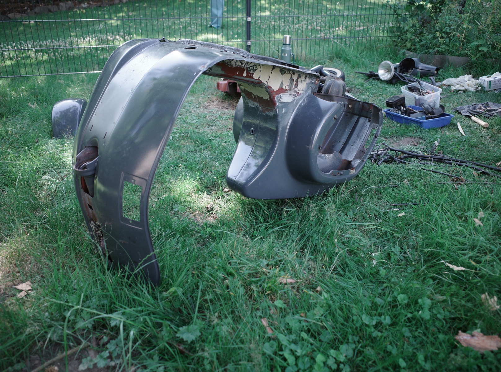 Erste Entlackungsversuche sollten zeigen, ob der rote Originallack noch zu retten ist. Leider ist großflächig geschliffen und gespachtelt worden: