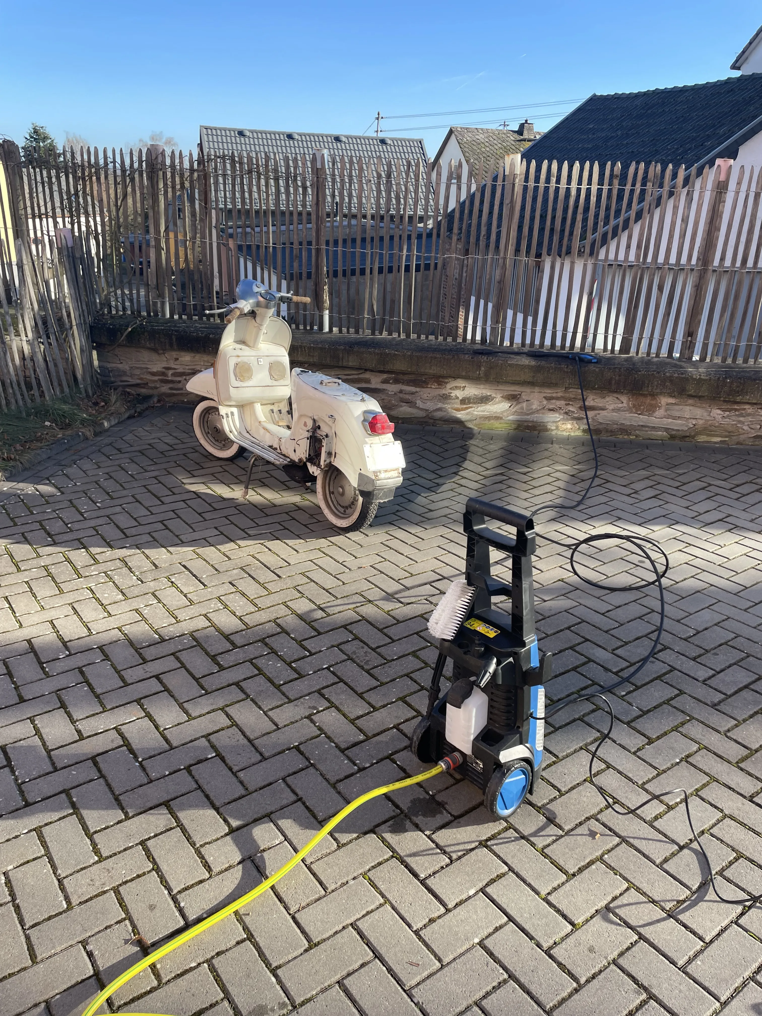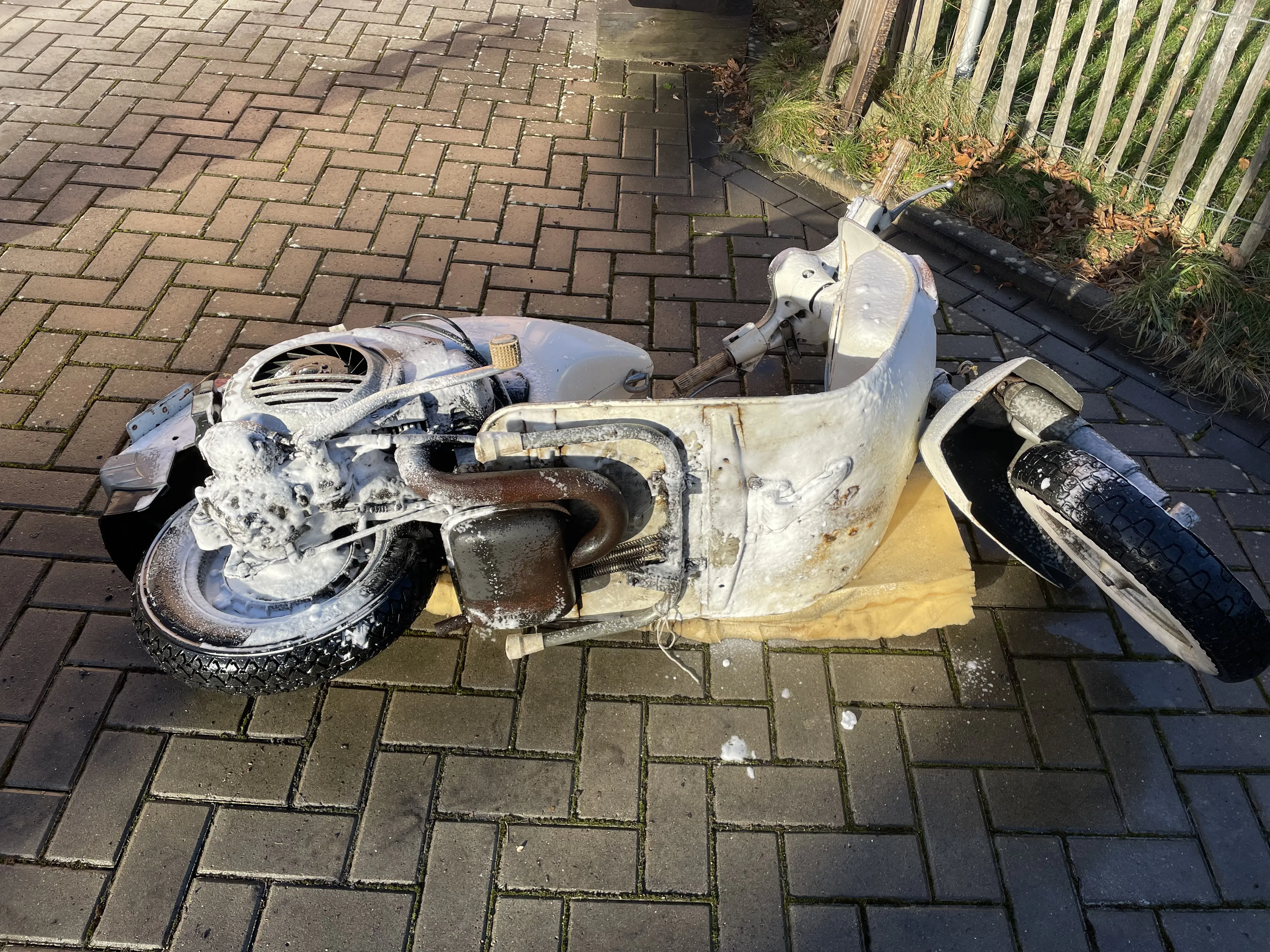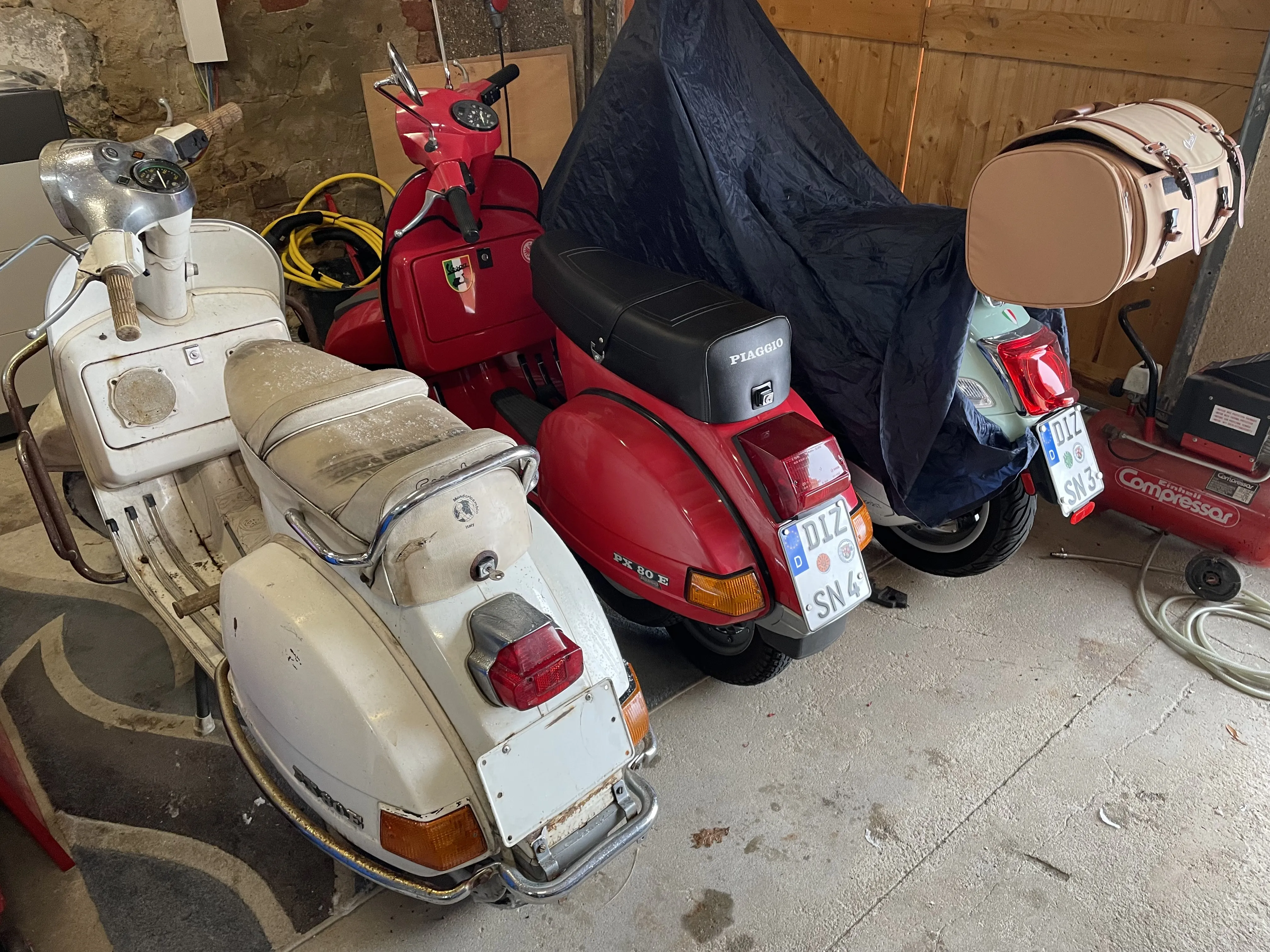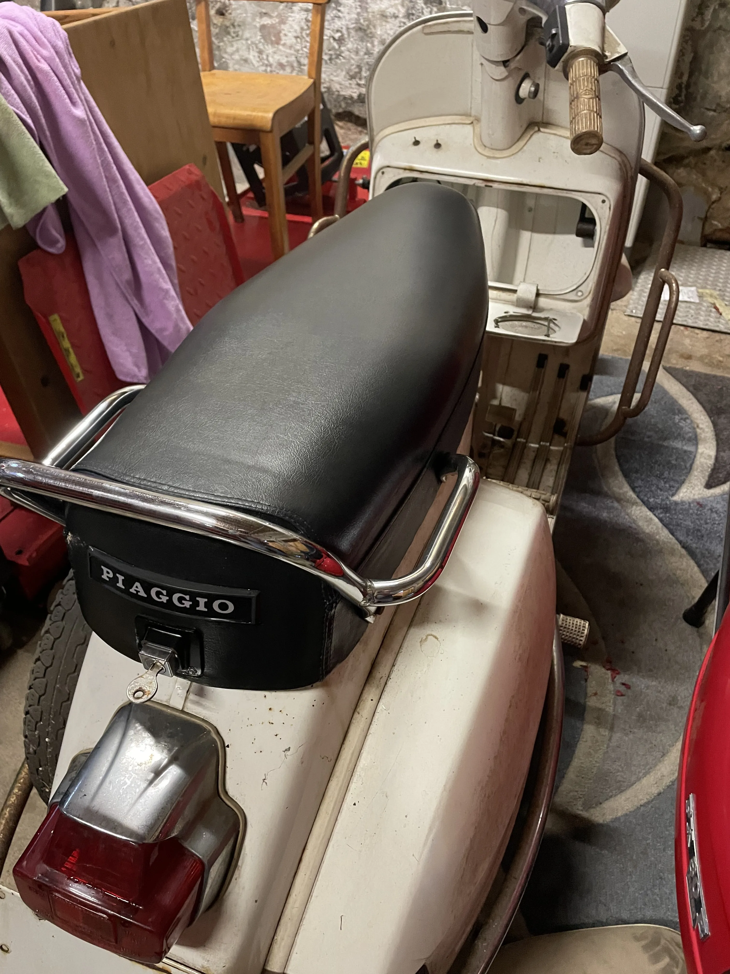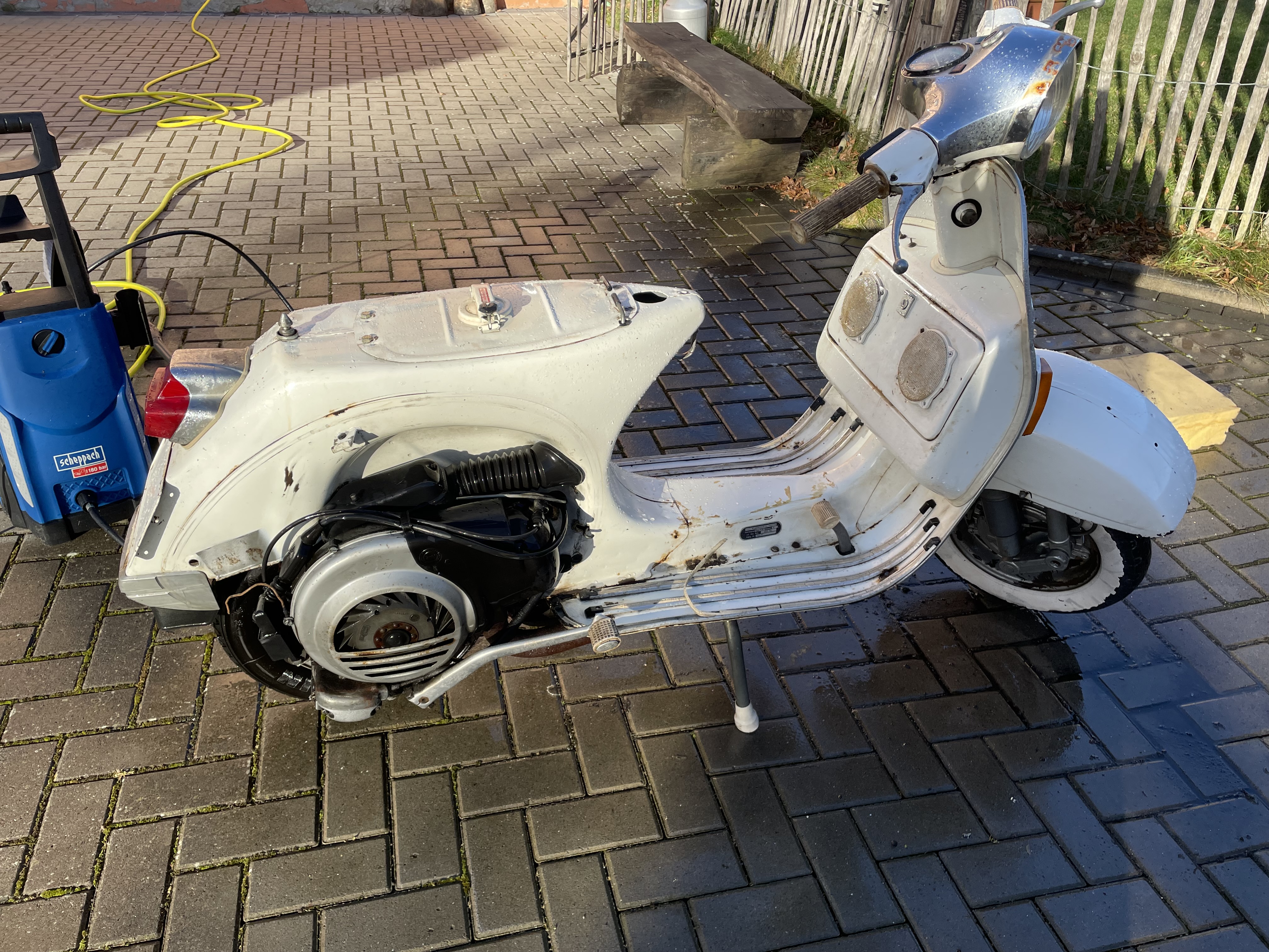 Der Originallack (Biancospino) wird aufgearbeitet, der Motor überholt und auf 125 cc umgebaut inkl. TÜV und eben technisch auf einen einwandfreien Zustand gebracht. Wenn sie dann mal fertig ist, soll sie evtl. einen anderen Besitzer bekommen... aber vielleicht bleibt sie auch![]()