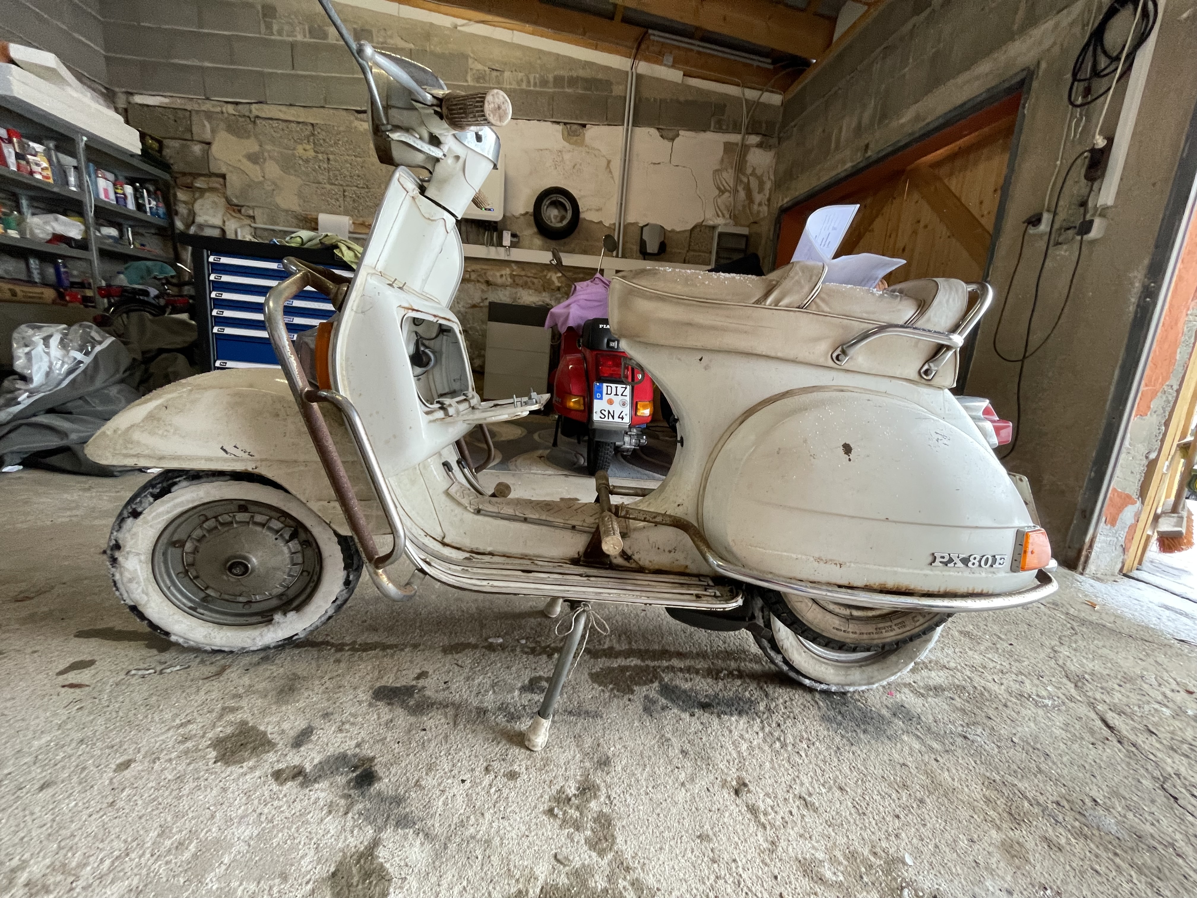 Weil mir die Aufarbeitung meiner PX 80 (135) so viel Spaß gemacht hat, habe ich nochmal zugeschlagen. Ich habe einen klassischen Scheunenfund erworben in Form einer 83er PX 80. 1.Hand, seit '92 abgemeldet. Sie sieht entsprechend gammlig aus, aber das Blech ist nicht betroffen, nur Flugrost.