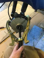 Da ich die Vorderradnabe nicht lösen konnte, kaufte ich bei Amazon einen 3-Backen-Abzieher für 40 Euro. Der war etwas groß, sodass ich das Rad ausbauen musste. Wenn ein kleinerer 3-Backen-Abzieher verwendet wird, muss das Rad nicht entfernt werden. Auch der Sicherungsring unter der Kronenmutter muss nicht entfernt werden.