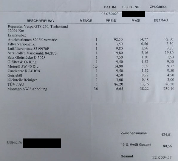 Seit der letzten Wartung in 07/2023 (siehe Foto) wurde die VESPA nicht mehr gefahren, sprang heute aber ohne Probleme an.