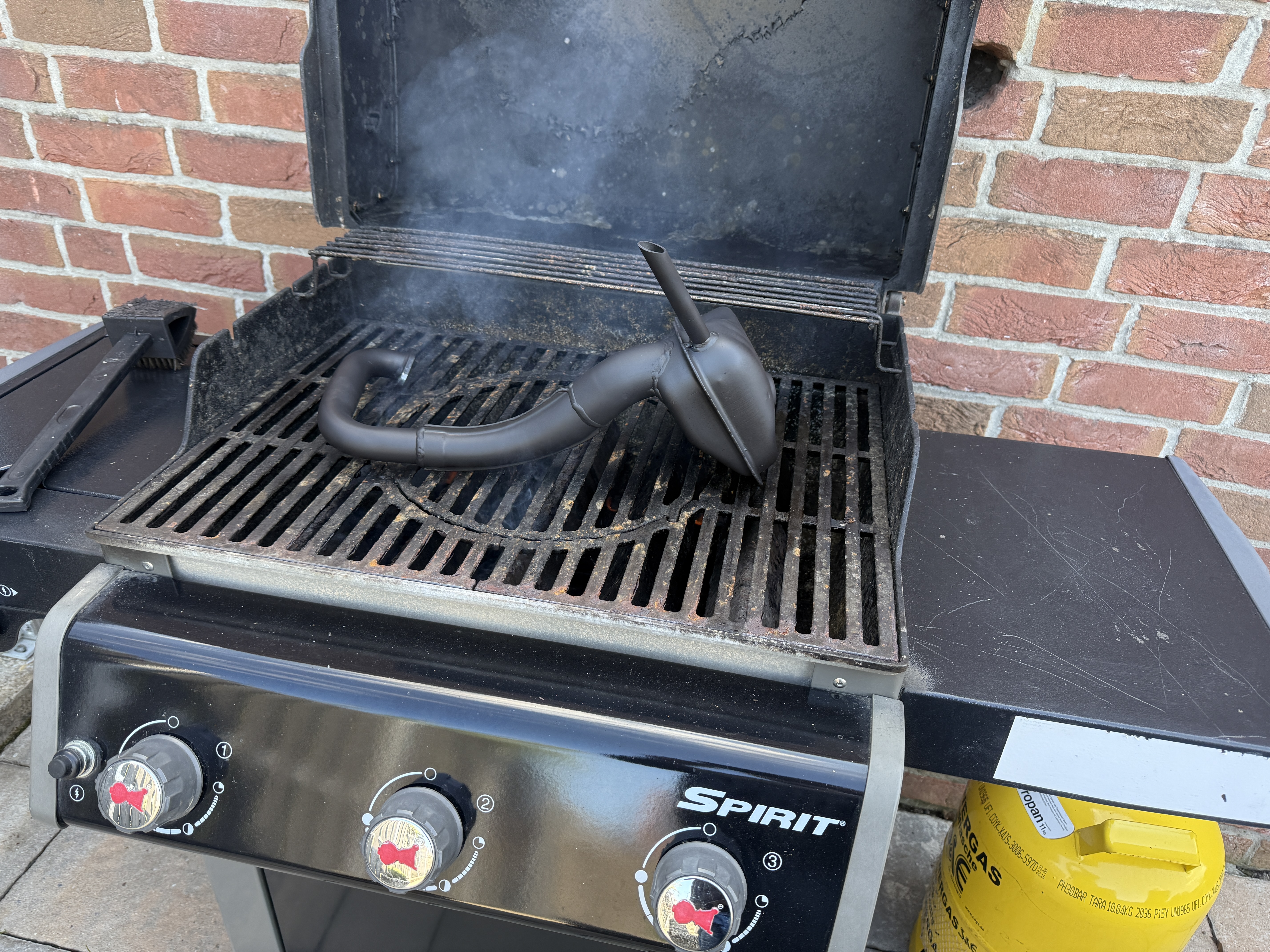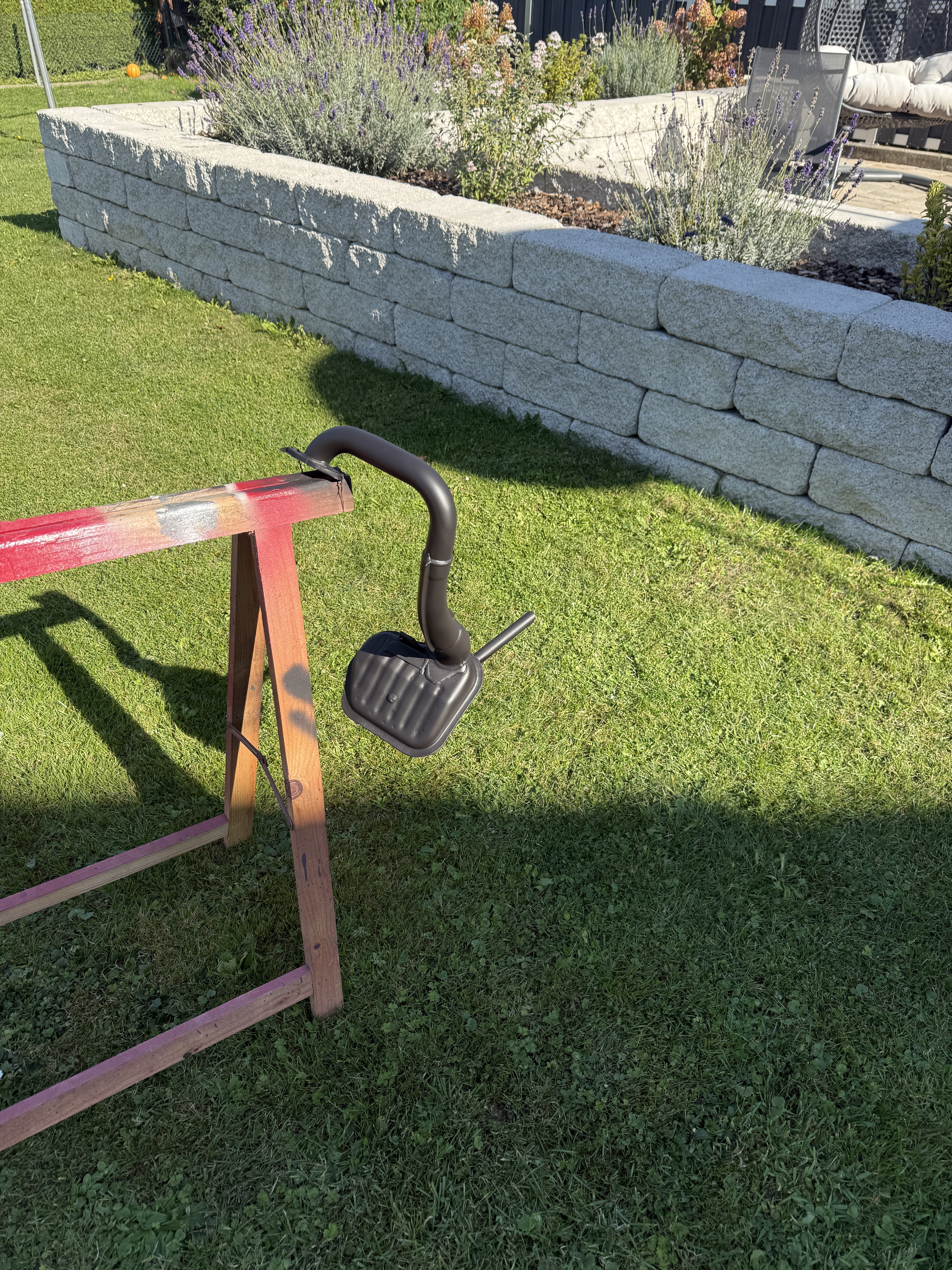 Hab den heute mittag dann mal lackiert. Anschließend wenigstens das erste und einzige mal dieses Jahr unseren Grill in Betrieb genommen und den Lack eingebrannt.