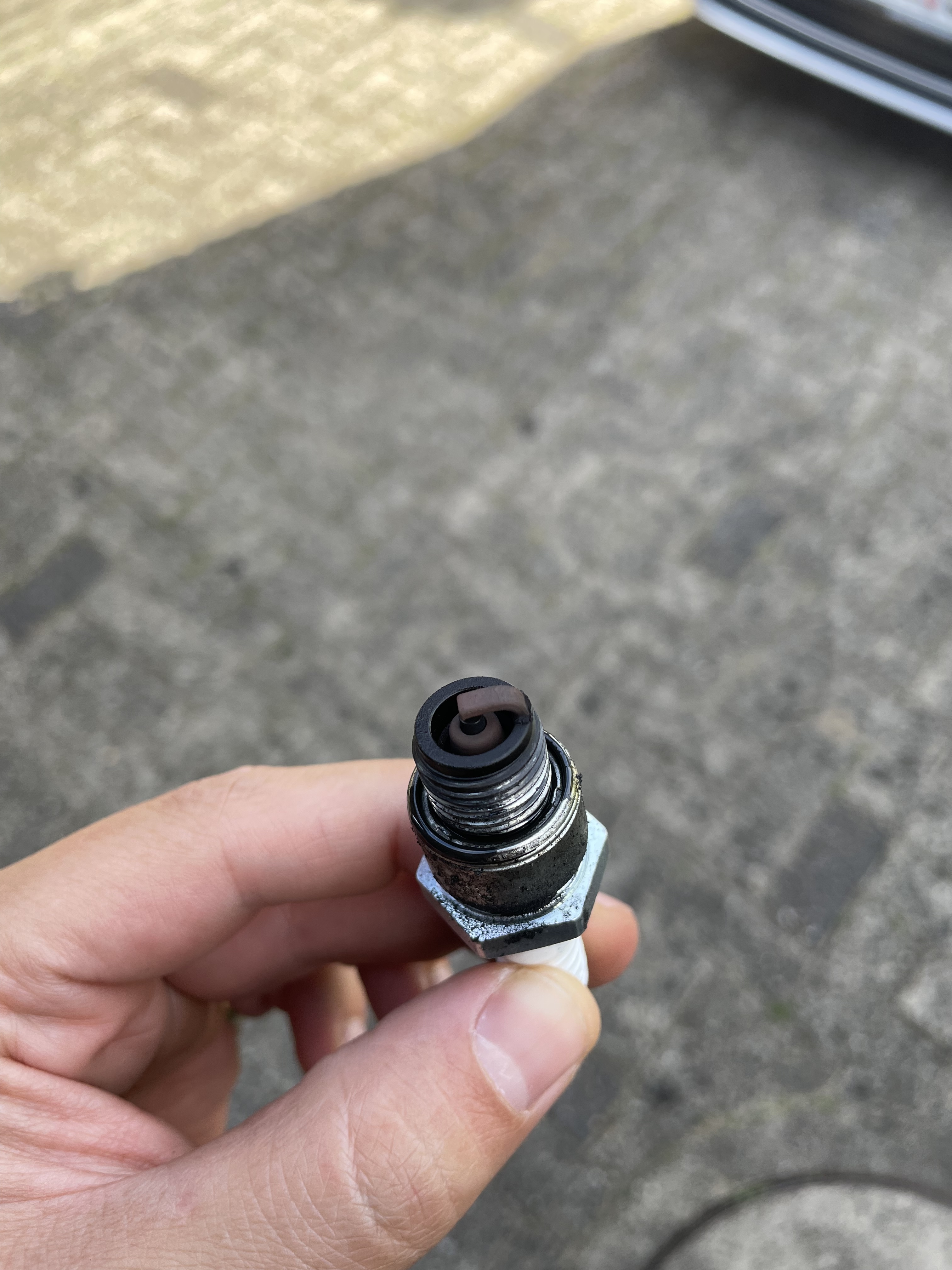 Ich habe dann gerade mal das Zündkerzenbild überprüfen wollen und festgestellt, dass die Zündkerze scheinbar locker im Gewinde saß, obwohl ich sie fest angezogen hatte … auch merkwürdig, vielleicht ziehe ich sie einfach noch fester an?! Oder liegt’s am kurzen Gewinde?