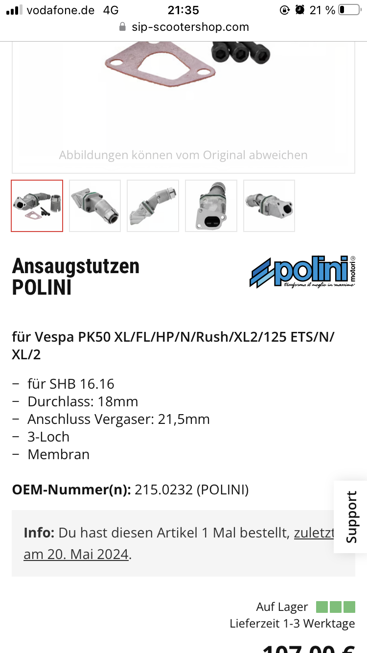 Es scheint alles dicht zu sein, also gehe ich mal davon aus, dass es doch der kaputte Drehschieber ist. Um ein erneutes spalten des Motors zu verhindern habe ich mir einfach einen Polini Membranansaugstutzen + SHB 16.16f bestellt, in der Hoffnung, dass das Hochdrehen ein Ende hat. Den Einlass vom Drehschieber habe ich nicht gefräst (brauche das extra "plus" an Leistung nicht, möchte erstmal dass der Motor läuft).