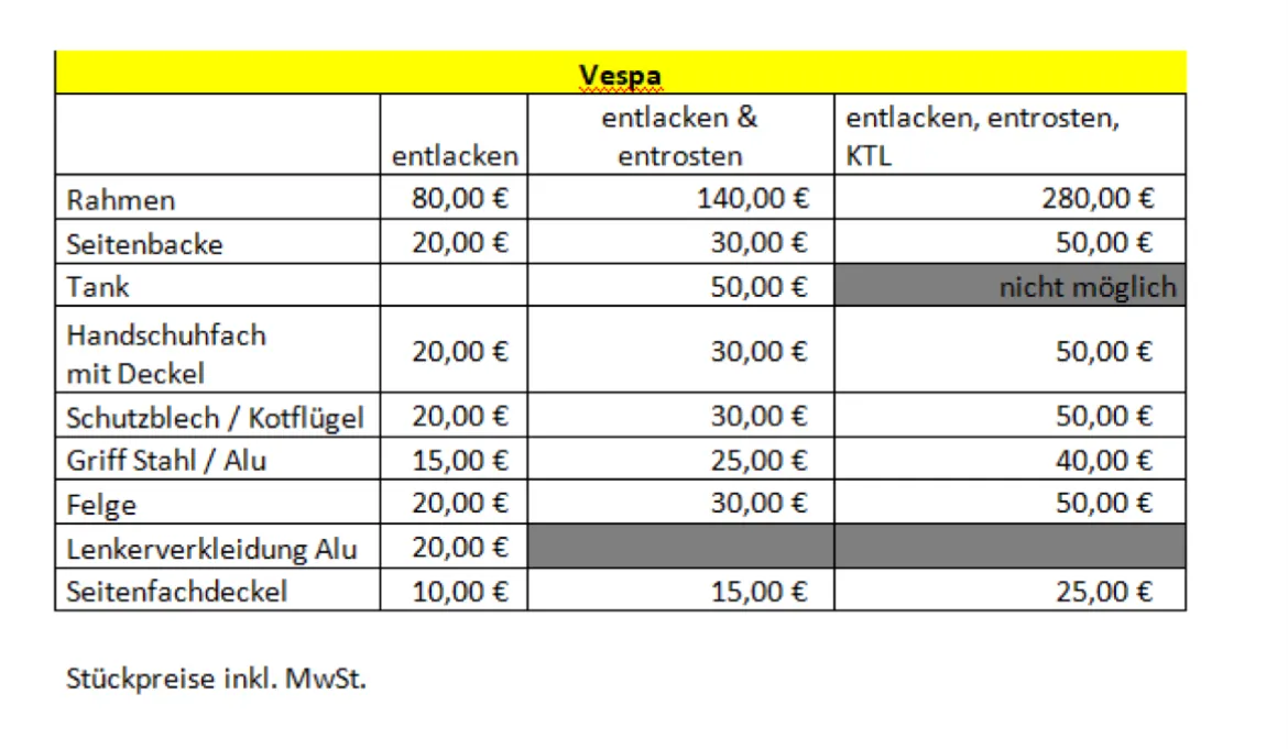 Das war die Preisliste von 2021 von Entlackerhelden/Syre. Hat damals relativ lange gedauert, glaube 2-3 Monate. Arbeit war sehr gut.