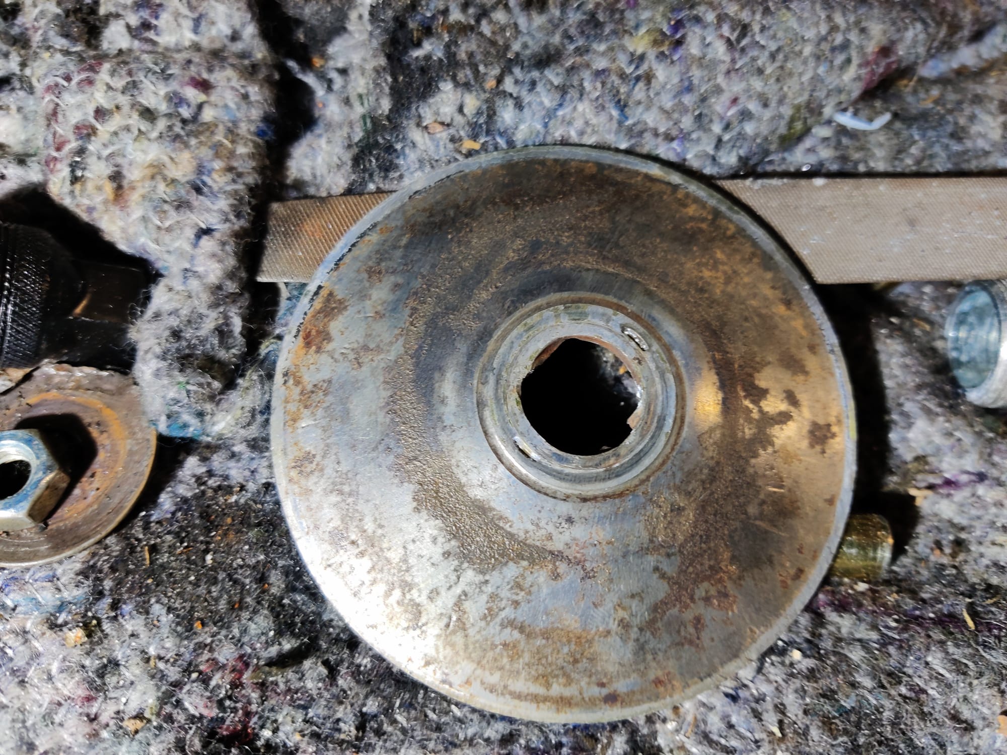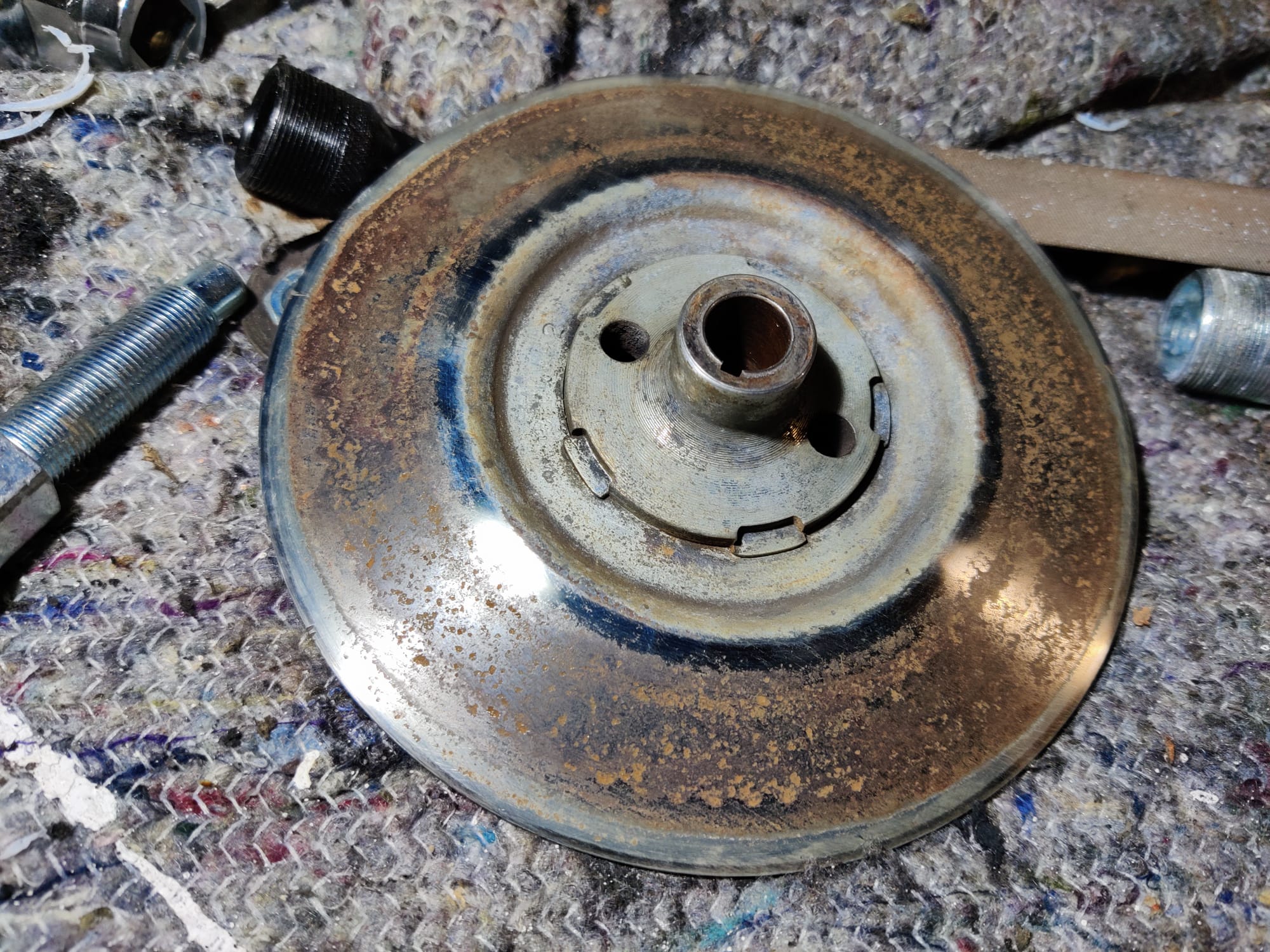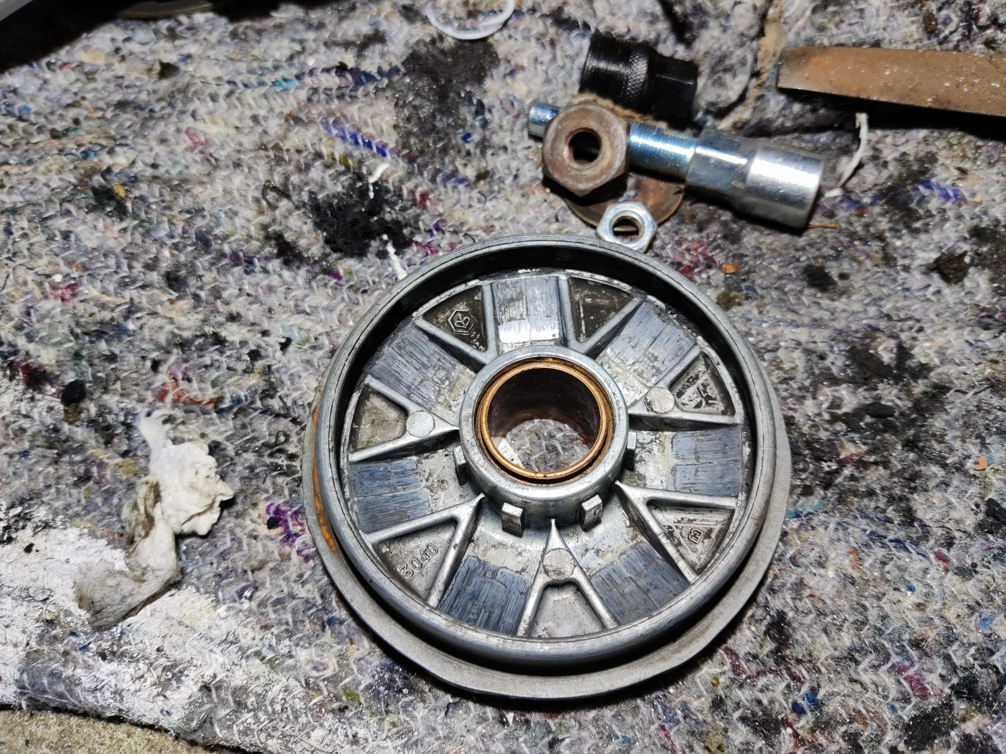 - Riemenscheiben der Vario und Kupplung haben deutliche Korrosionsspuren. Diese habe ich bereits mit feinem Schleifpapier und Wasser wieder schön glatt bekommen, aber es gibt Lochfraß und über Kurz oder Lang werde ich um einen Austausch durch Gebrauchtteile wohl nicht drum rum kommen