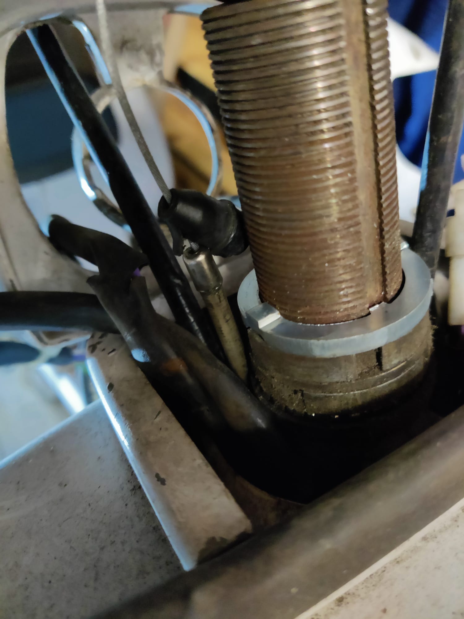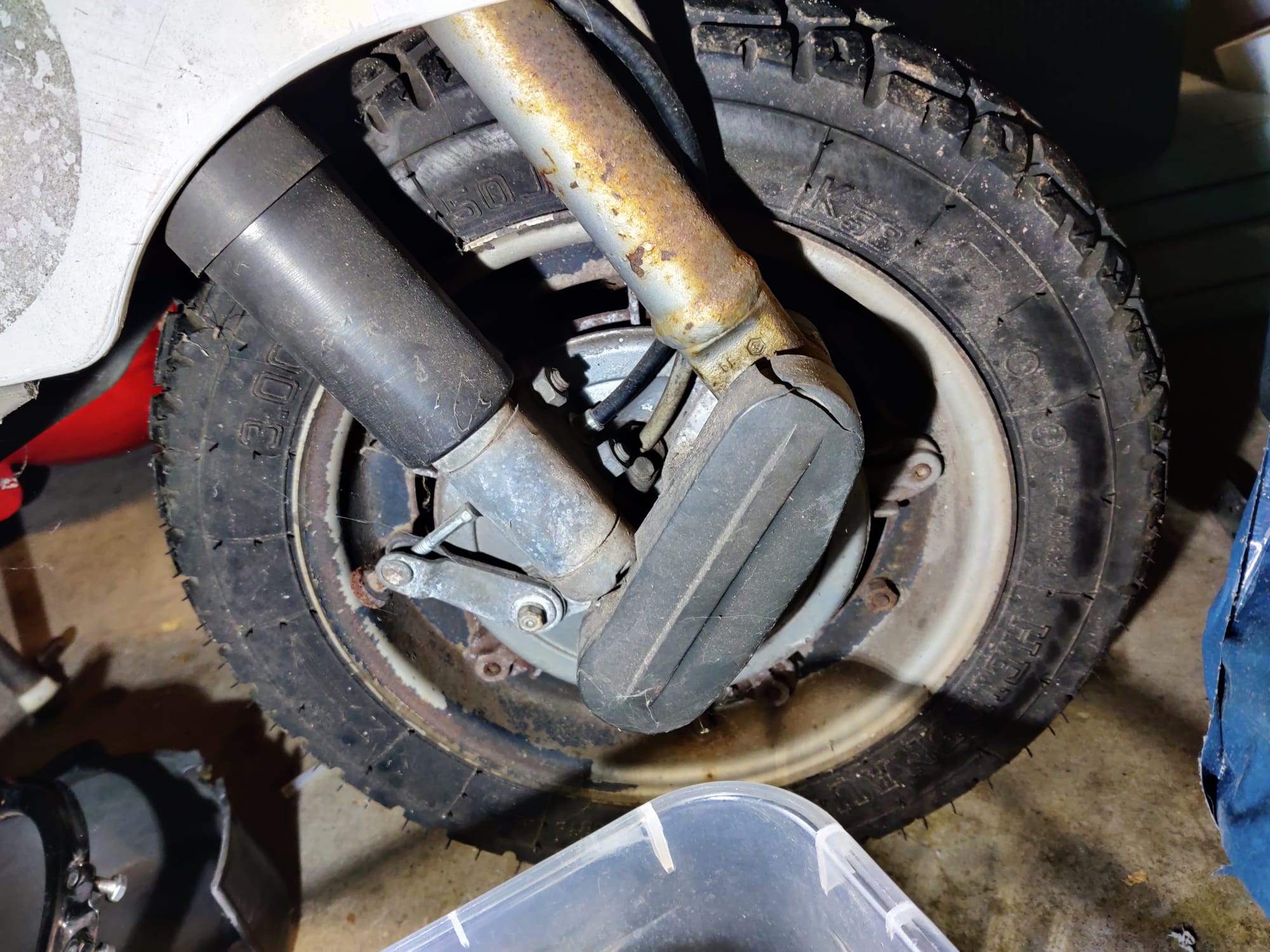Sie lief dann noch einige Zeit, aber immer wenn es nass war, ging sie mir nach einiger Zeit auf der Straße aus und war praktisch nicht mehr zum Fahren zu bewegen, bis sie komplett durchgetrocknet war. Ich ging daher davon aus, dass es irgendwo einen Masseschluss durch Feuchtigkeit geben müsse. Dann ging irgendwann der Lenker lose und ich habe festgestellt, dass die Nasenscheibe an der Lenkstange keinen Halt mehr in der Lenkstange hatte, da die Haltenasen der Scheibe einfach weggegammelt waren.