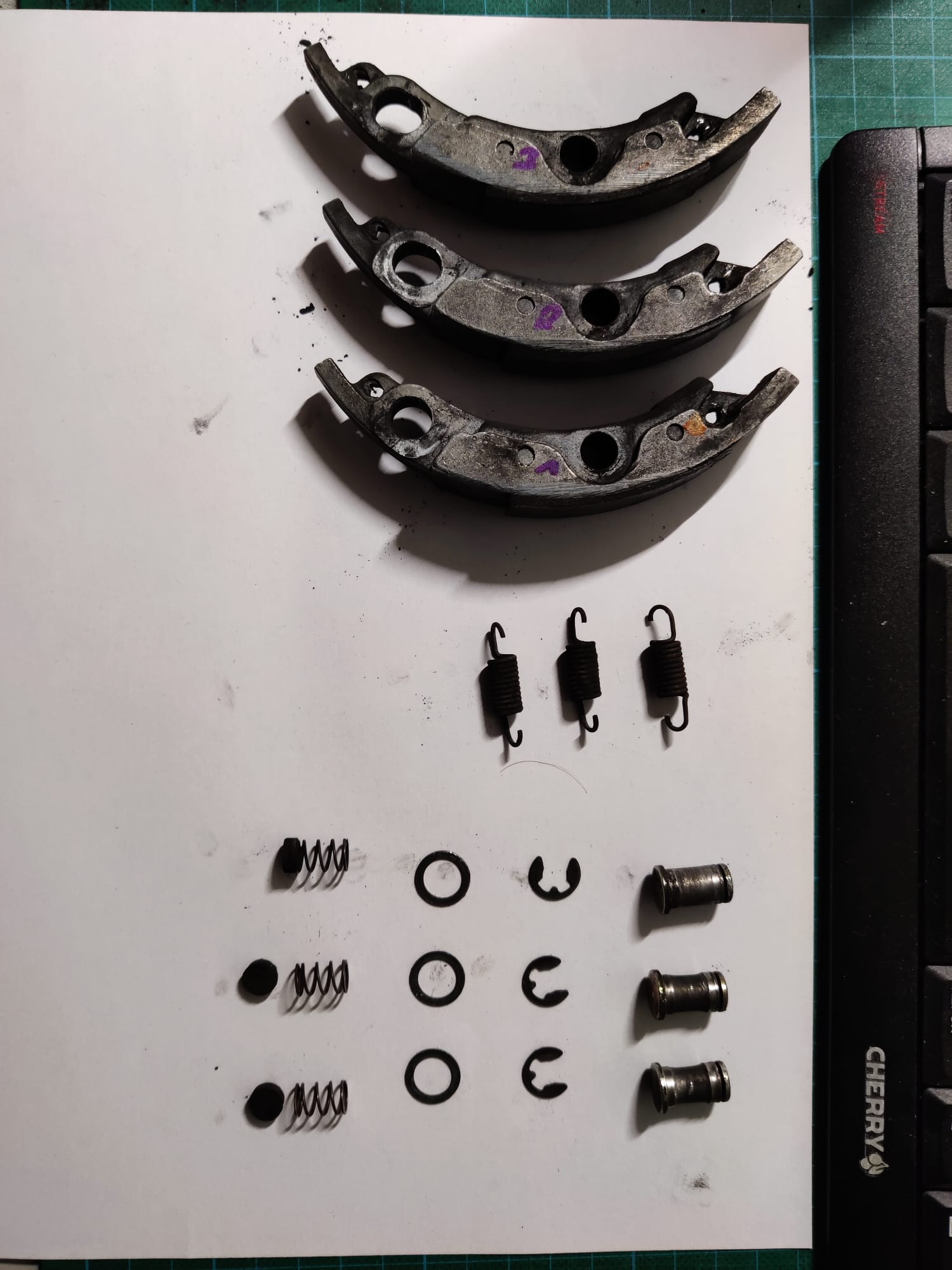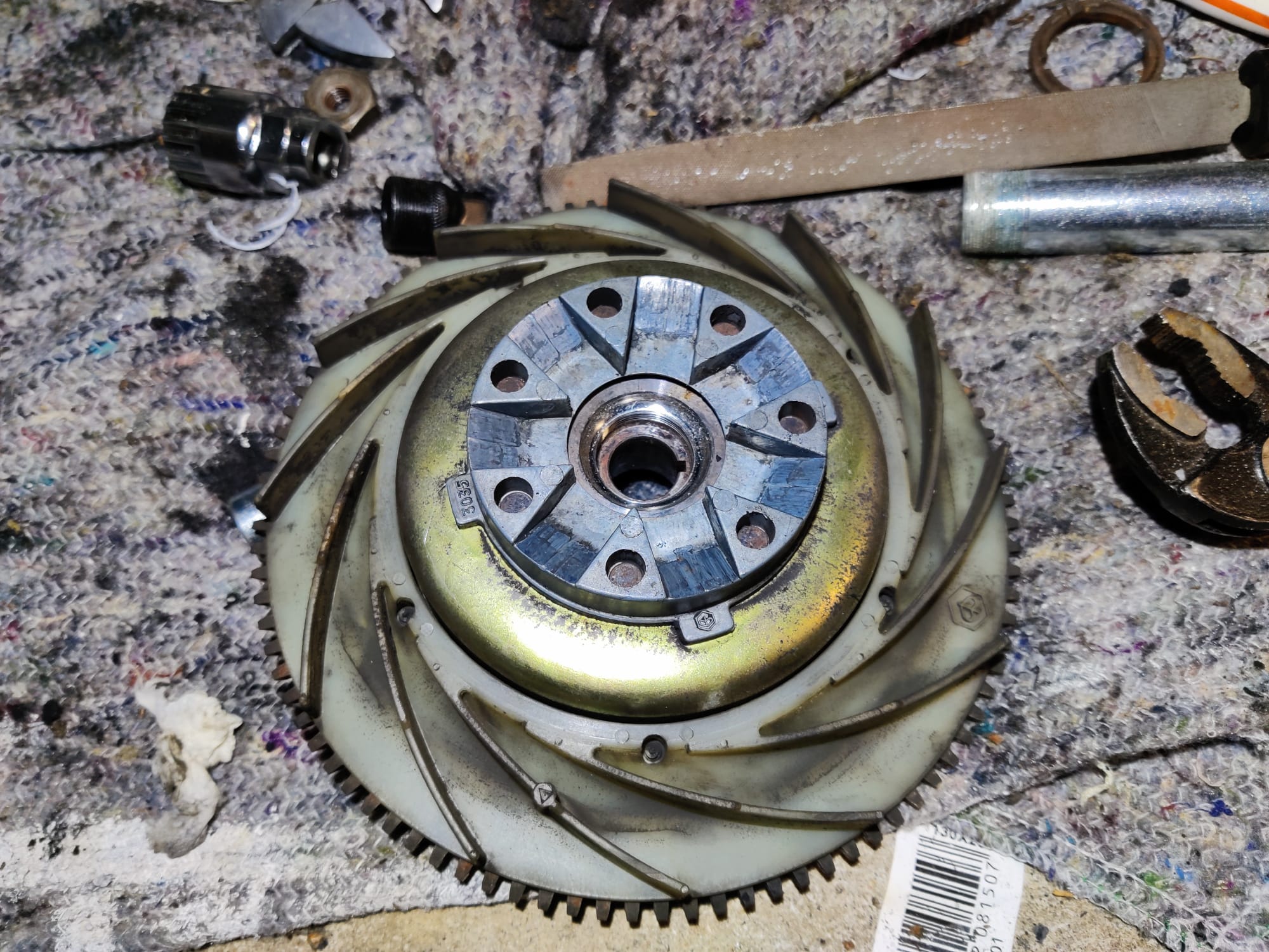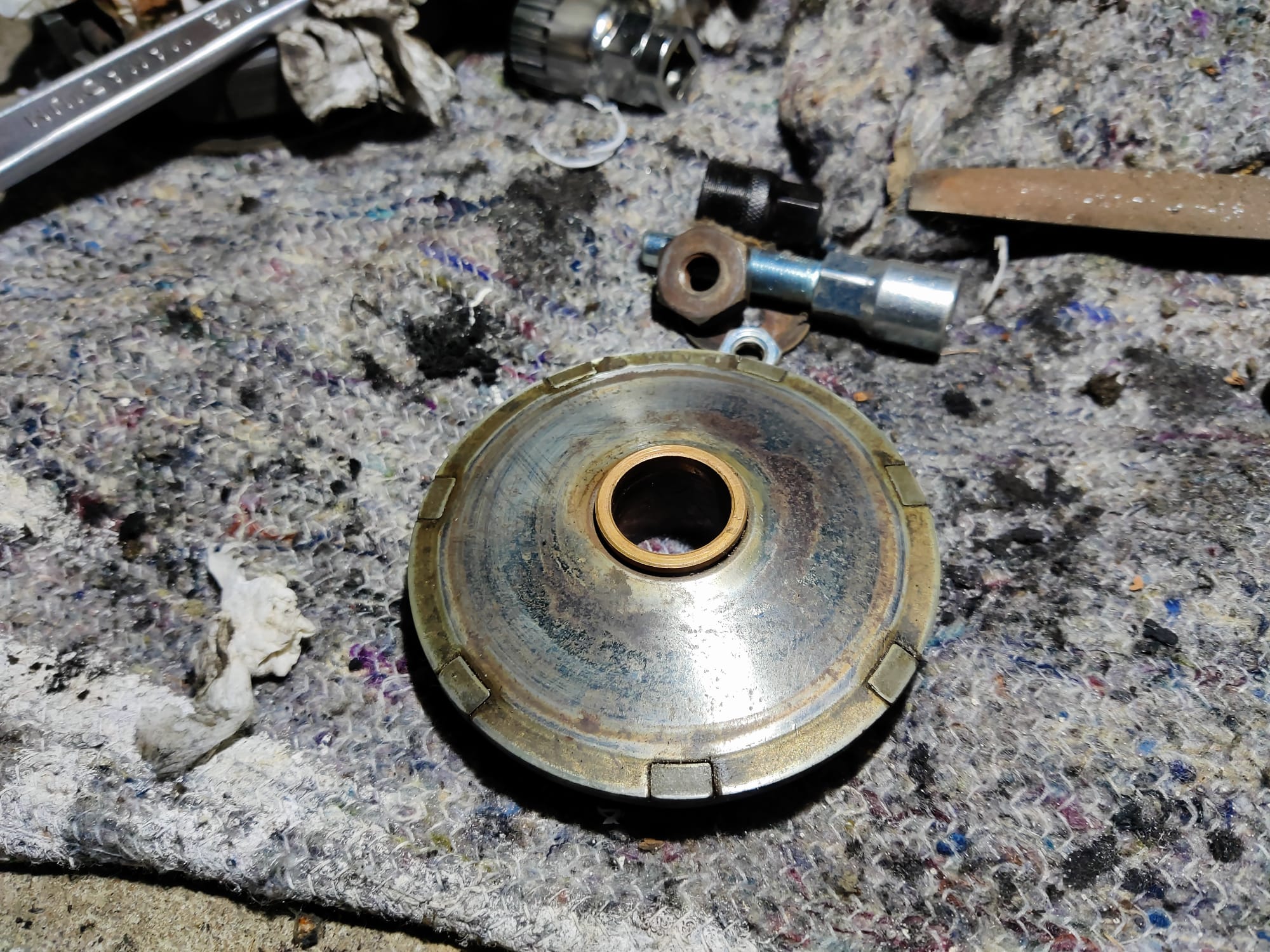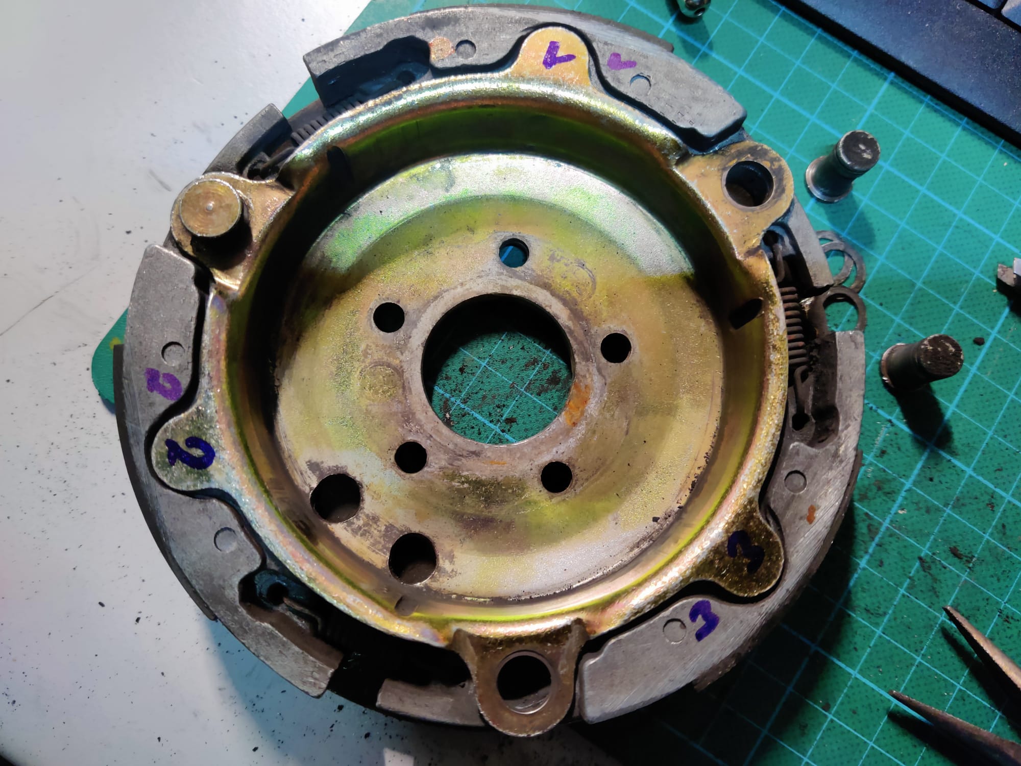 - Fliehkraftkupplung: Die Reibbeläge sind runter und müssen definitiv neu! Die Kupplungsglocke dürfte nah an der Verschleißgrenze sein und hat auch Riefen innen. Hier werde ich versuchen die Glocke auszudrehen, aber mittelfristig brauche ich da auch was Neues
