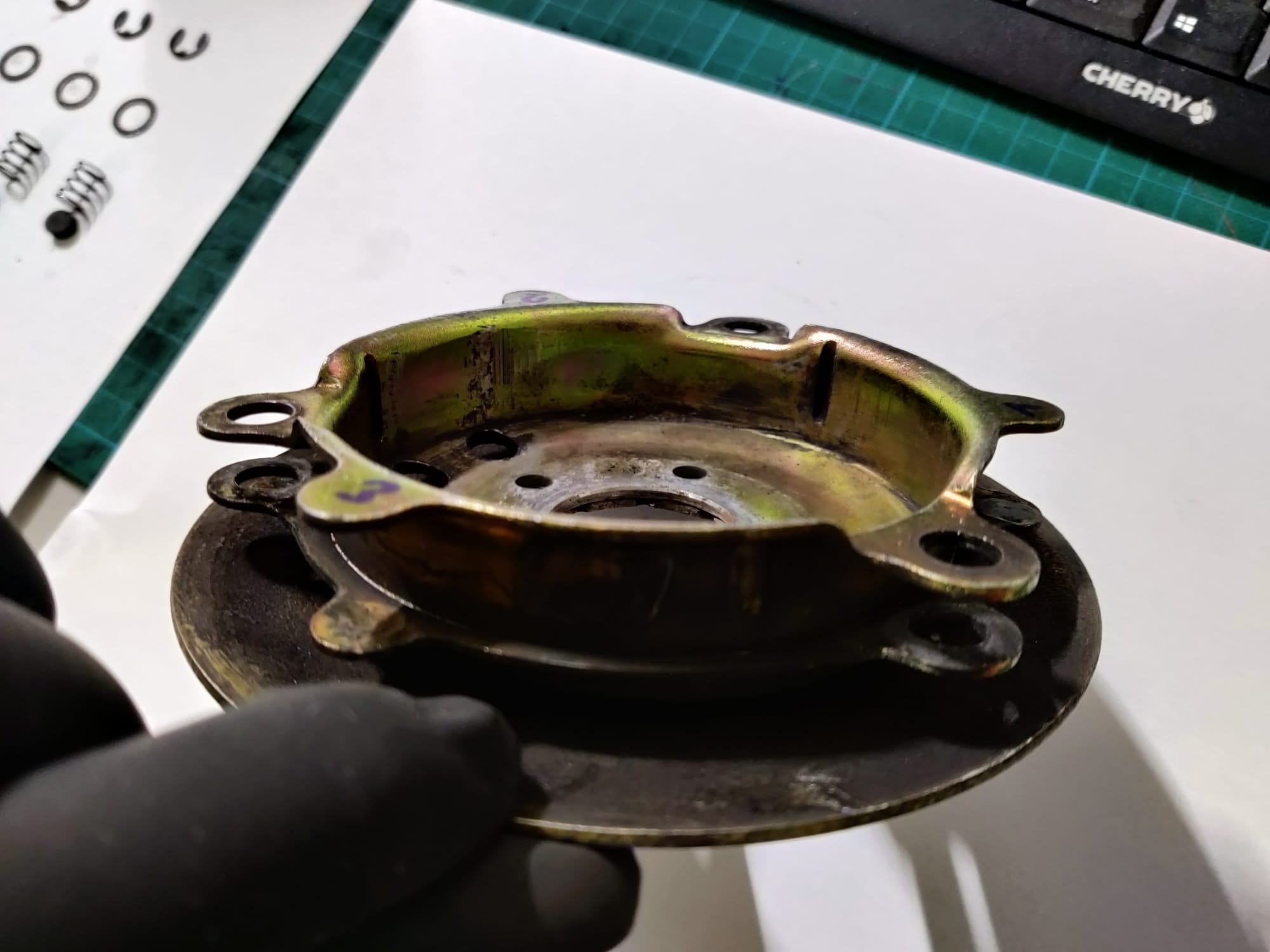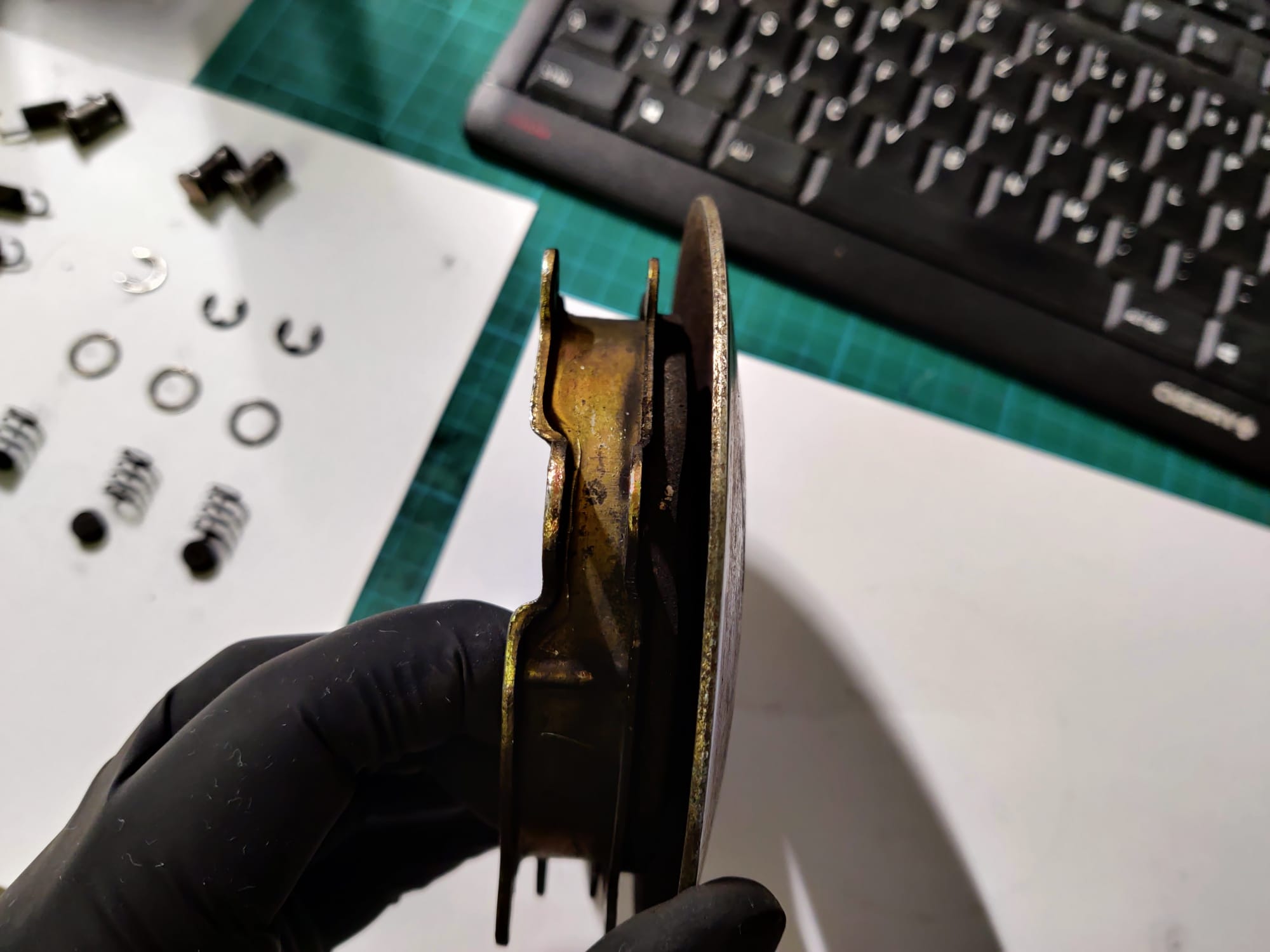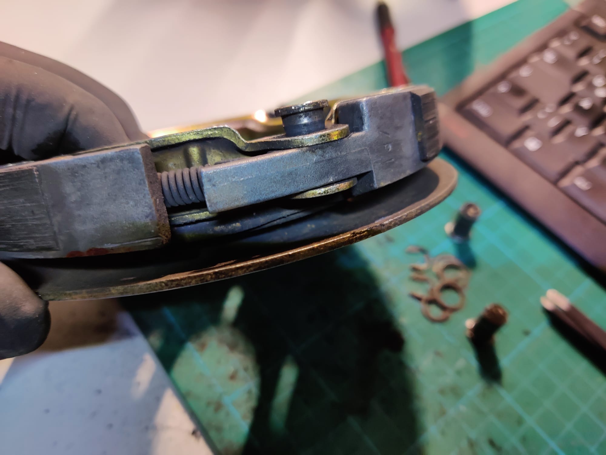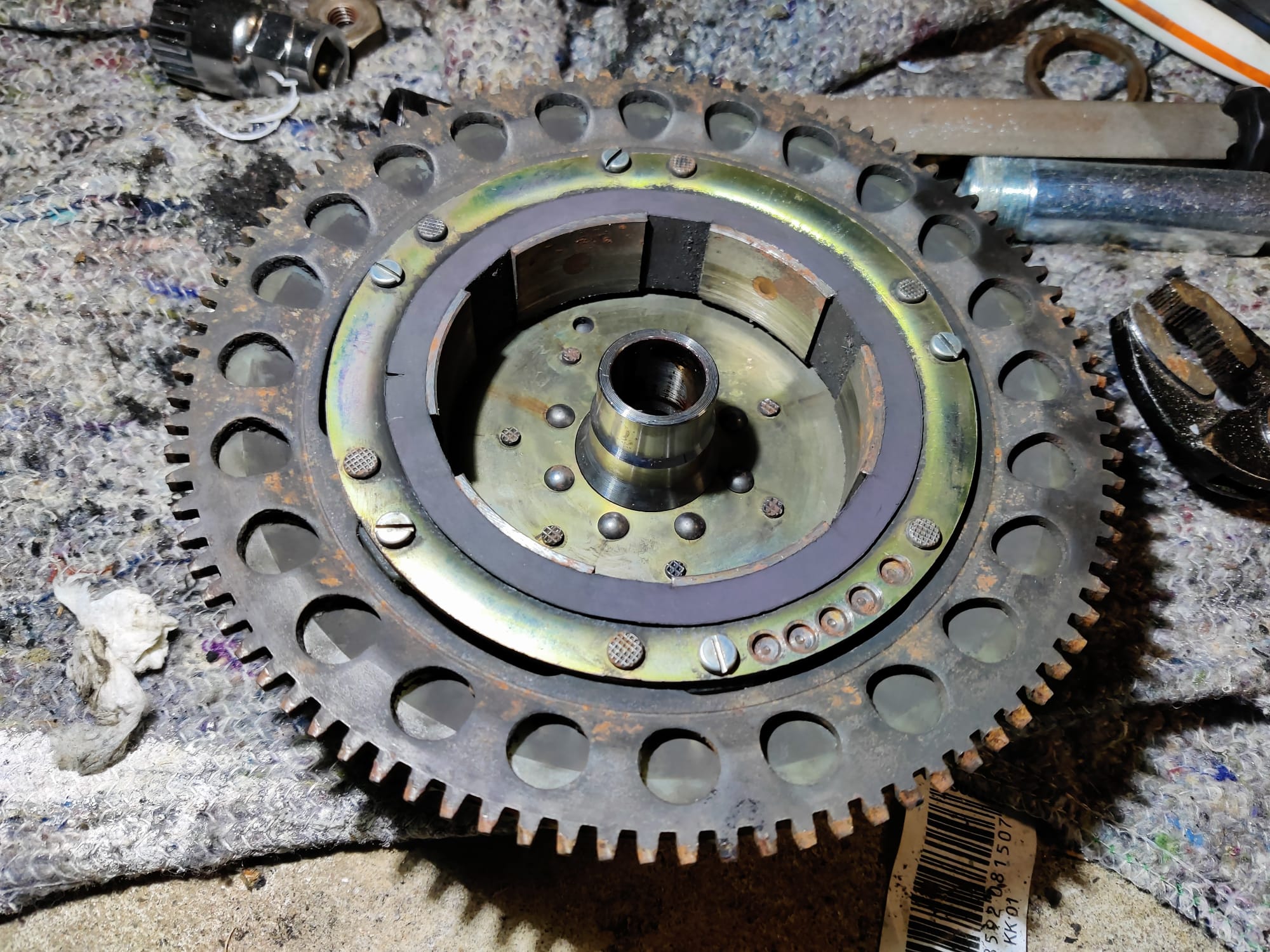 - Fliehkraftkupplung: Die Reibbeläge sind runter und müssen definitiv neu! Die Kupplungsglocke dürfte nah an der Verschleißgrenze sein und hat auch Riefen innen. Hier werde ich versuchen die Glocke auszudrehen, aber mittelfristig brauche ich da auch was Neues