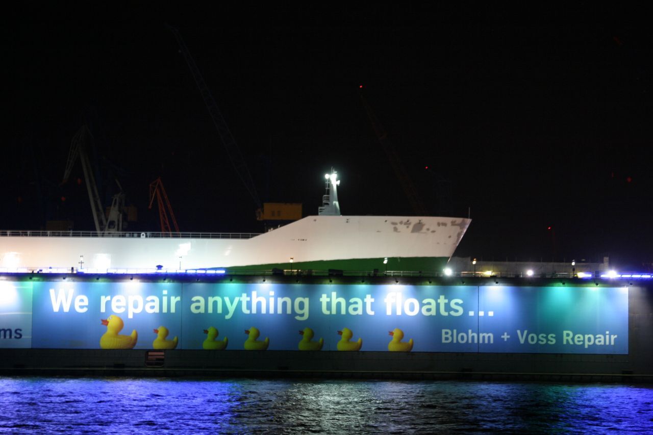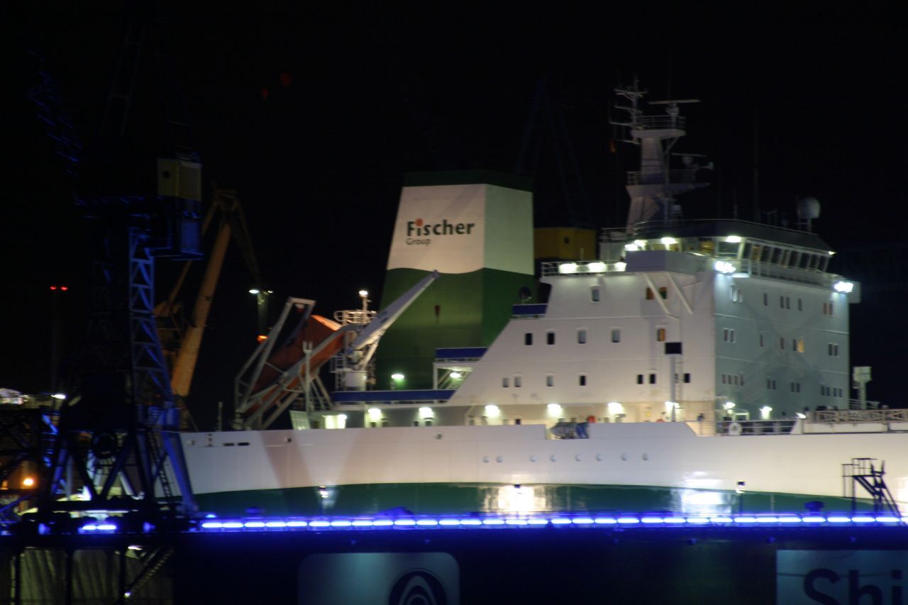 Zurück dann mit Wasser in den Tanks und einigen Containern an Deck. -
