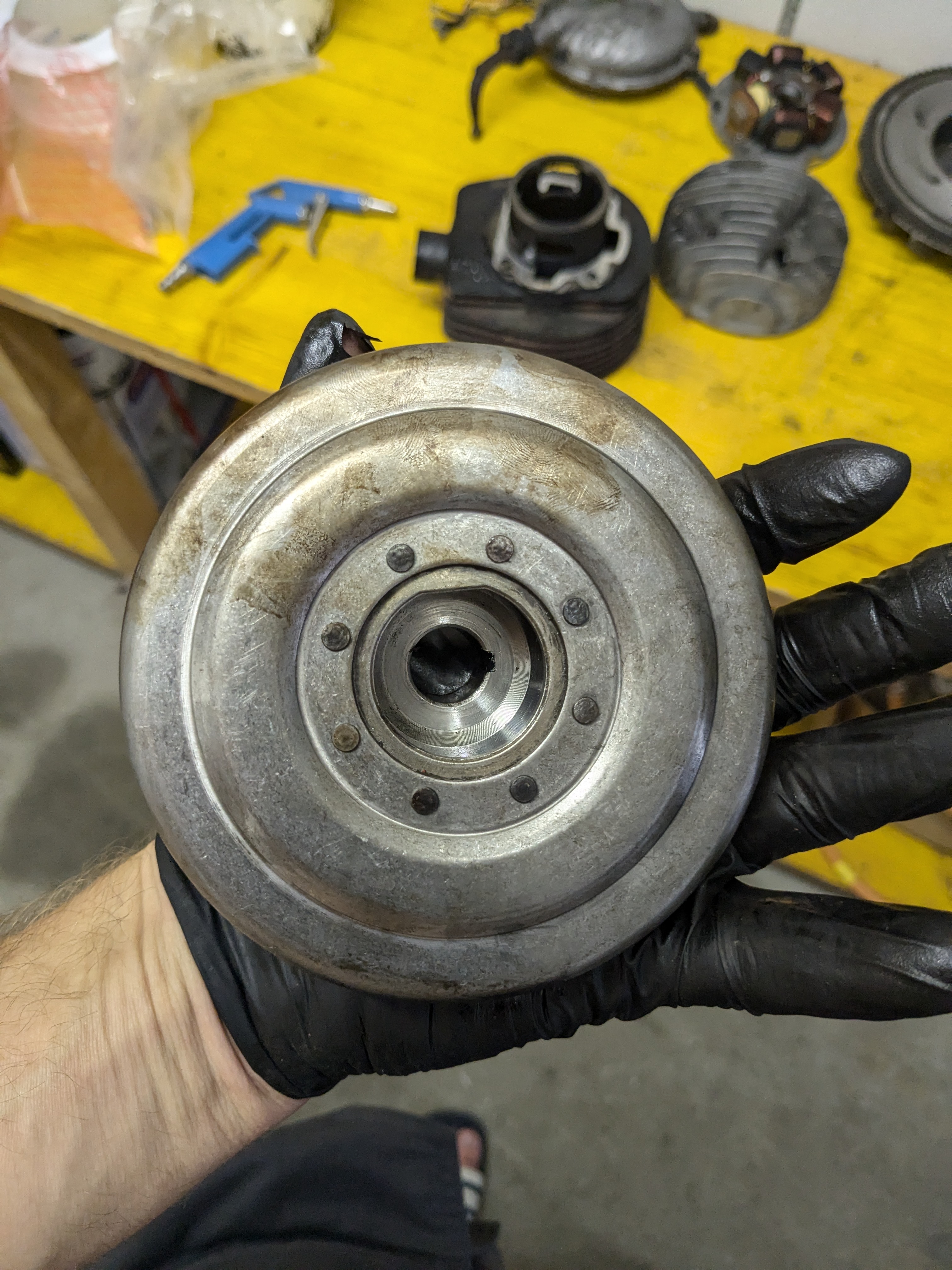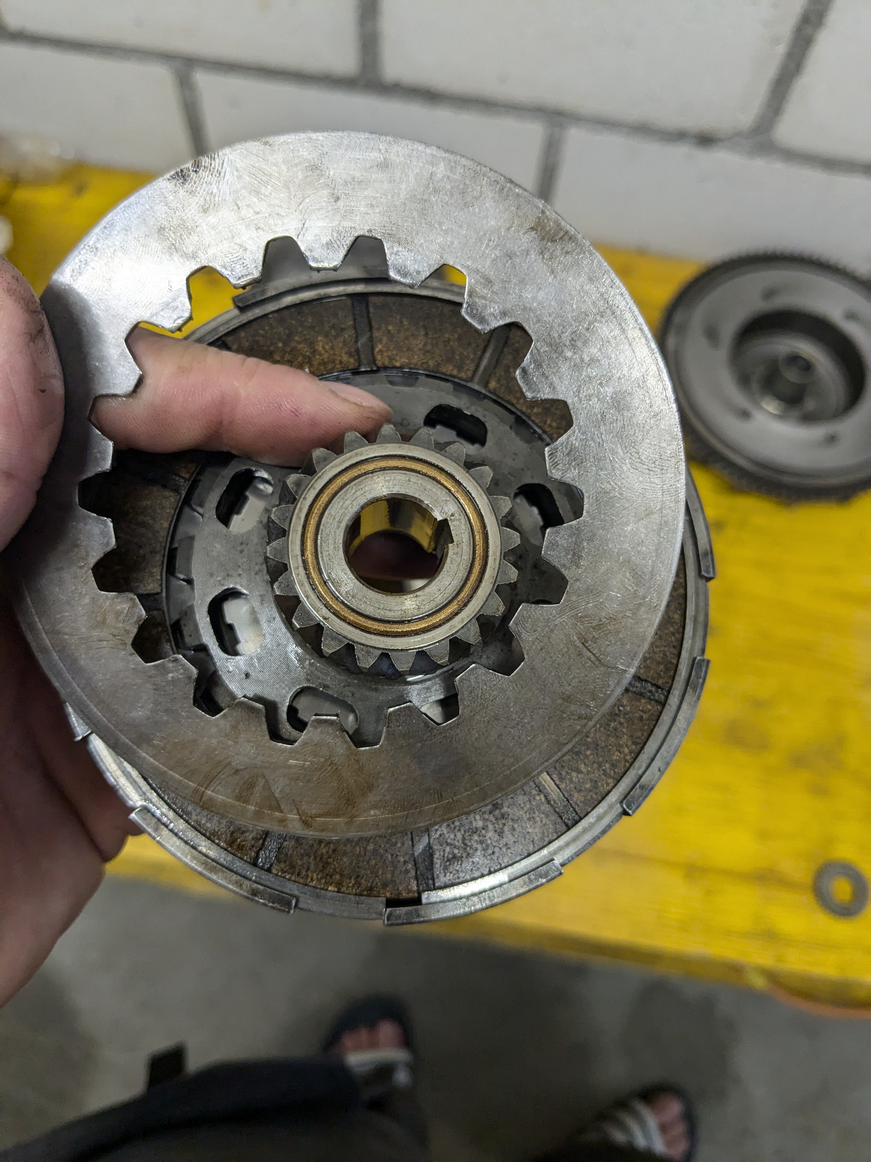 oder sind jetzt schon zwei) einen Riss in im Motorengehäuse, also habe ich passende Hälften gesucht. Fand aber einen occasion Motor, so kaufte ich diesen und baute ihn gleich ein (laut Verkäufer nur 11'000km und alles top). Seit Beginn hatte ich das gefühl die Kupplung ist irgendwie nicht gut und bemängelte dies direkt nach dem Kauf, der Verkäufer wollte davon natürlich nichts mehr wissen... Nun gut, ich war zu faul wieder alles auseinander zu nehmen also fuhr ich einfach weiter. Es ging ja war aber nicht unbedingt schön zum scchalten... letztens wo ich kaum noch gut schalten konnte nahm ich mir vor die Kupplung anzuschauen. Auf dem Weg in meine Werkstatt (jetzt rund 800 km nach Kauf) konnte ich plötzlich sehr einfach schalten und alle Gänge gingen geschmeidig rein. Doch auf einmal war Schluss mit der Kraftübertragung, zum Glück nur 50 Meter vor der Werkstatt. Ich baute den Motor jetzt auseinander und bin total Verwirrt, zum einen war die Kupplung nicht mit einer Spannmutter oder Kronenmutter gesichert sondern mit einer Messingmutter, sollte man das überhaupt? Aber noch vieeeel mehr verwirrt bin ich von der Kupplung selbst, sollte die letzte Distanzscheibe nicht auch vom Spannring im Kupplungskorb gehalten werden? Als ich die Kupplung rauszog viel dieser nämlich einfach runter.... Oder ist das hier gar keine Cosa Kupplung? Auf alle Fälle habe ich das noch nie gesehen und bin etwas verwirrt, Aufklärung Eurer Seits könnte nicht schaden!