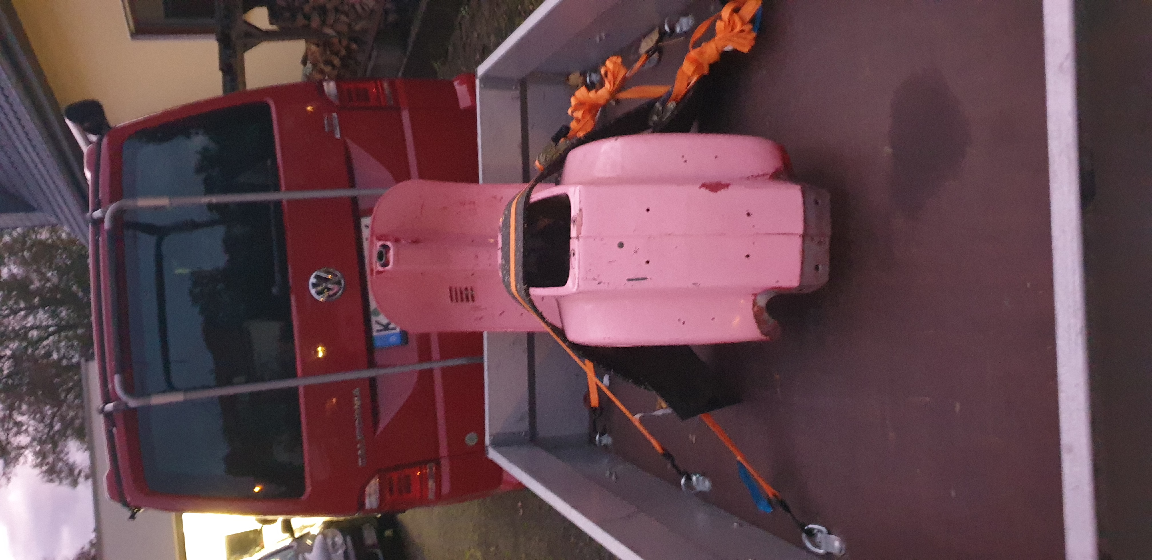 Ja, CSD in Diez, roter Bulli mit Kölner Kennzeichen zieht pinke Vespa die mit orangen Gurten ge-bondage-t ist.