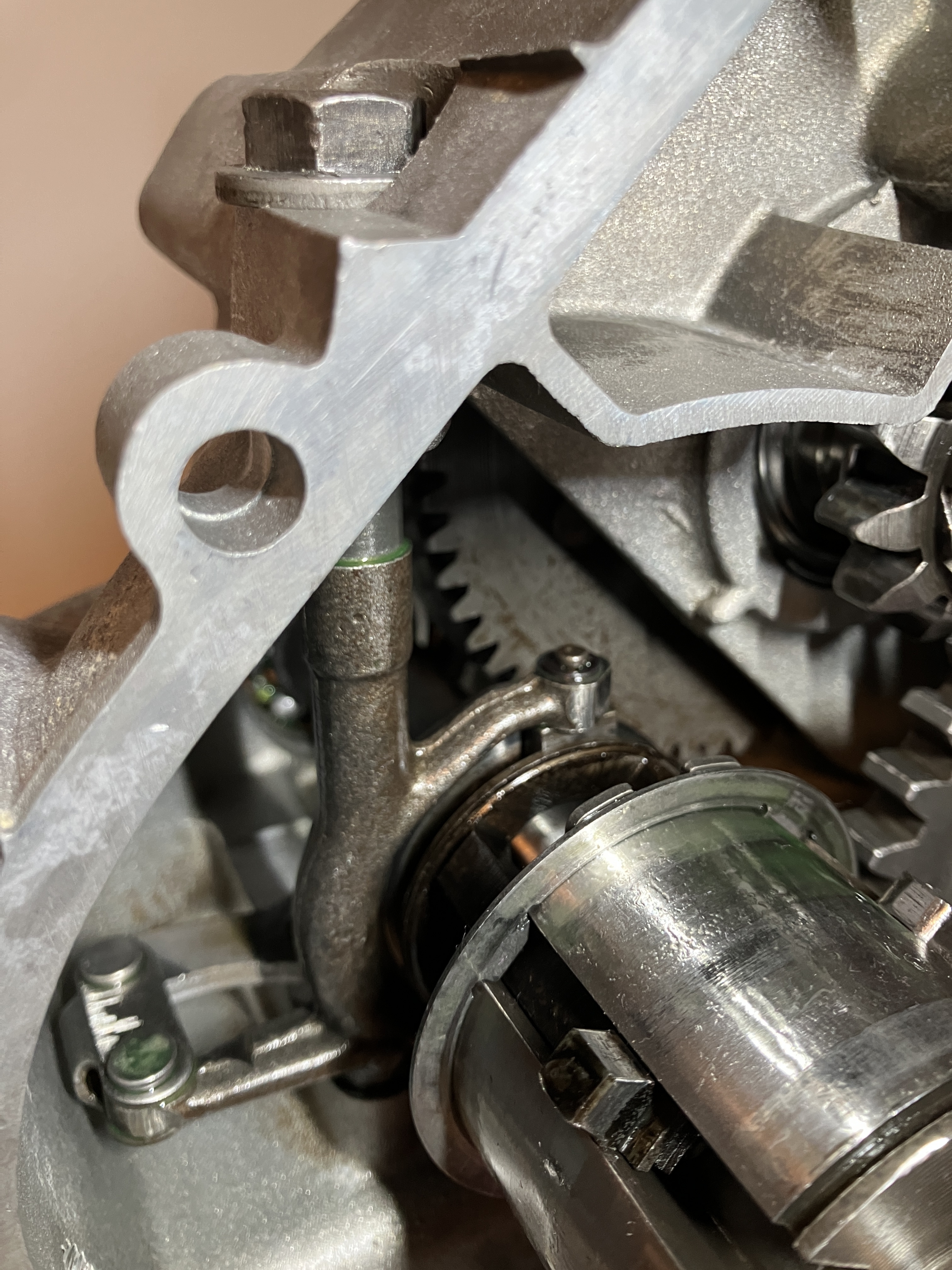 Auf deinem Bild ist der zweite oder dritte Gang eingelegt, die Schaltklaue als ziemlich weit in den 4 Führungen drinn. Wenn du sie weiter nach hinten Richtung Lager ziehst, ist die Nut der Klaue hinter den beiden Schalterarmen und in dieser Stellung könnten die Arme mit einem Schalterarm in Berührung kommen. Ich geh aktuell davon aus, dass mein Lager zu viel Spiel hat und tausch das erstmal aus. Um auszuschließen das die Welle einen Schlag hat, fehlen mir Zuhause leider die Möglichkeiten das auszumessen.
