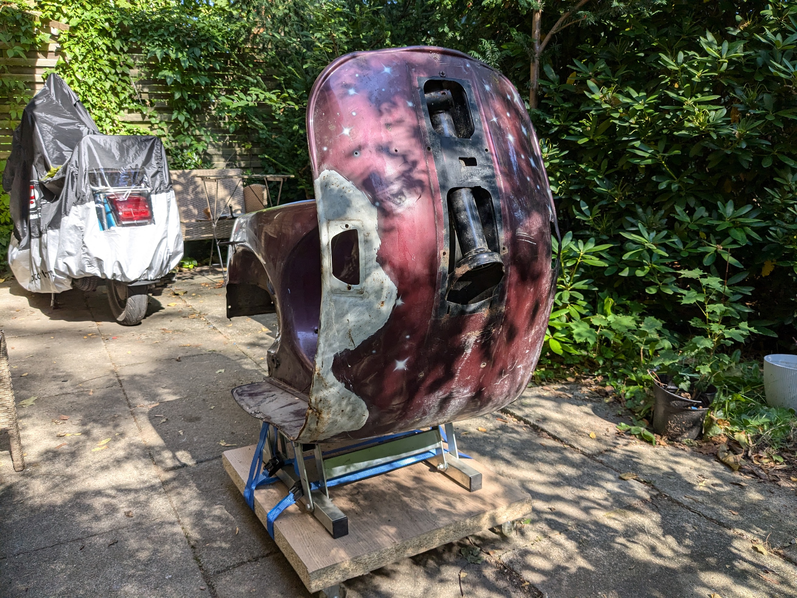 Der Rahmen ist jetzt (bis auf eine Schraube, die gar nicht will) nackig. Die Sicherungen für die Seitenhauben haben ein bisschen Schwierigkeiten gemacht aber sind jetzt raus und sicher verstaut.