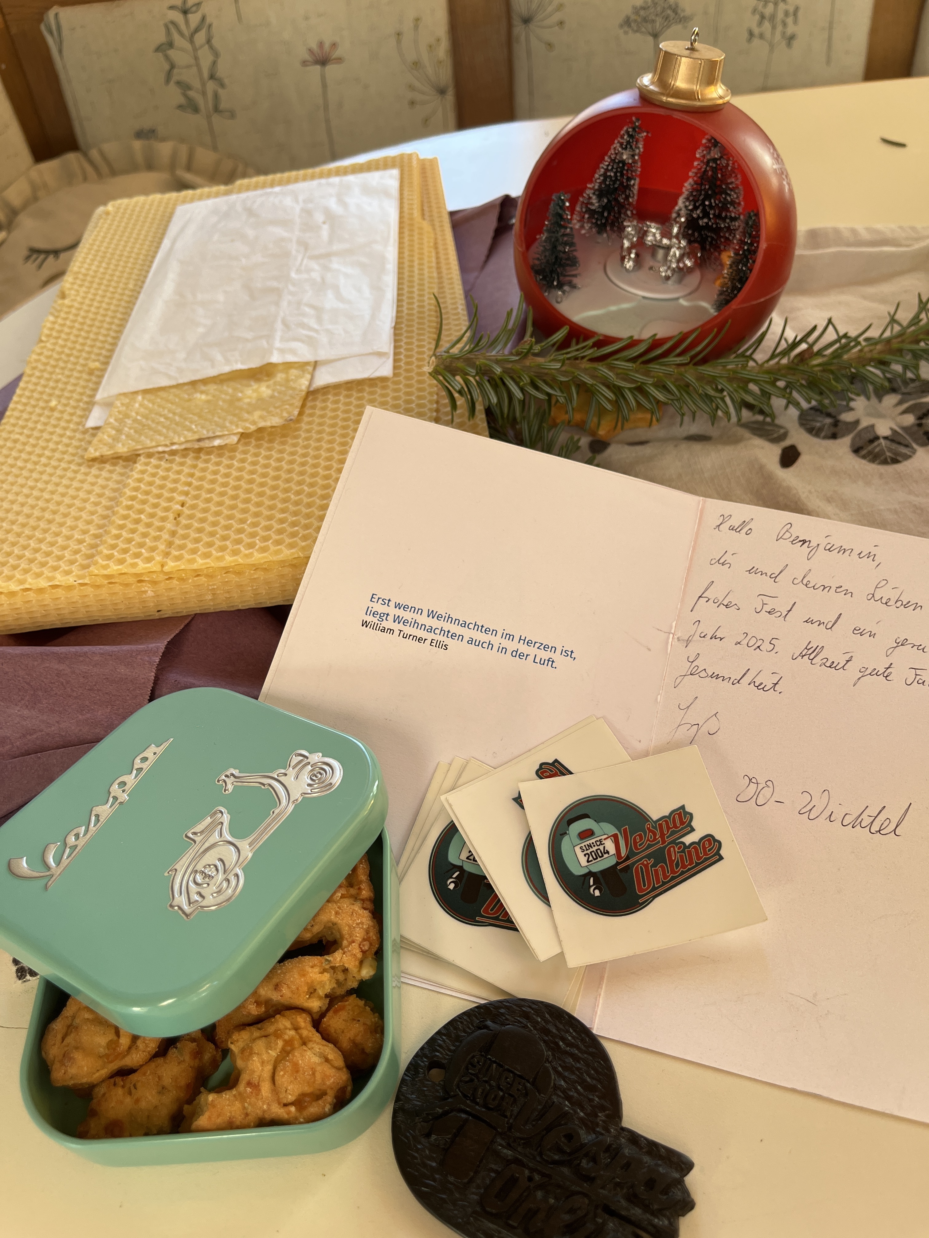 Vielen Dank an meinen Wichtel :) die weihnachts Kugel mit dem Vespa Karussell ist Mega! Und die mit Vespa Keksen gefüllte Vespa Dose. Vielen Dank auch für das Bienenwachs 🥰👍