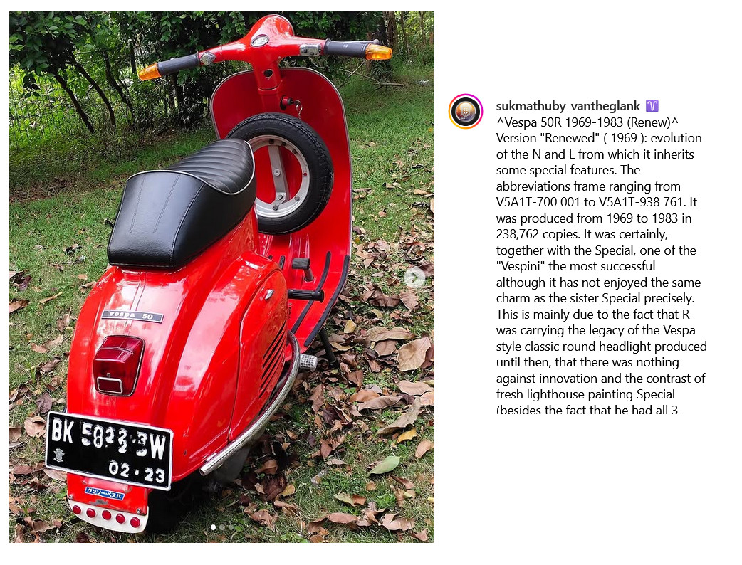 • Ich möchte jetzt nicht eure Kompetenz anzweifeln, was Originalität angeht. Aber da es bei Piaggio offensichtlich unendlich viele Varianten gab und wohl die meisten Roller, die jetzt rumfahren, importiert sind, beziehen sich wohl die meisten Aussagen auf italienische Ausführungen. Meine ist nicht importiert und daher wohl geringfügig anders ausgestattet als die meisten. Kann schon sein, dass einer meiner Vorbesitzer etwas geändert hat (Lenker tauschen?), aber ich halte das für unwahrscheinlich. Warum sollte man das an einem relativ neuen Roller tun? Genauso halte ich das Baujahr für authentisch. Eine '73er auf '70 zurück zu datieren wäre '79 unsinnig gewesen, weil das den Wert gemindert hätte. Einen 6 Jahre alten Roller hätte ich damals sicher nicht für 350 DM bekommen.