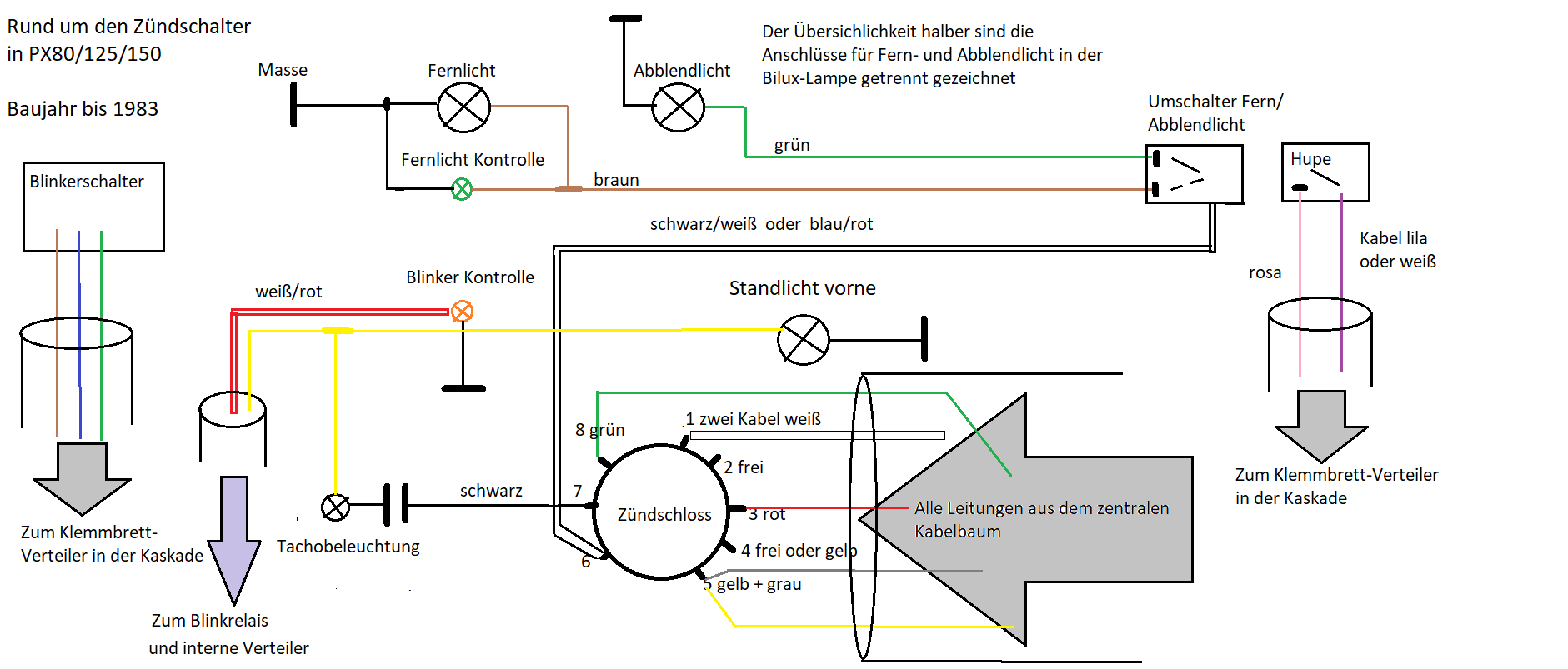 Nachdem mir flackernde und glimmende Kontrollleuchten meiner PX80 - aufgestockt mit DR 135 - signalisierten, daß da irgendwas baufällig ist, habe ich in den letzten Tagen die gesamte Elektrik im Lenkerkopf überholt. Also: