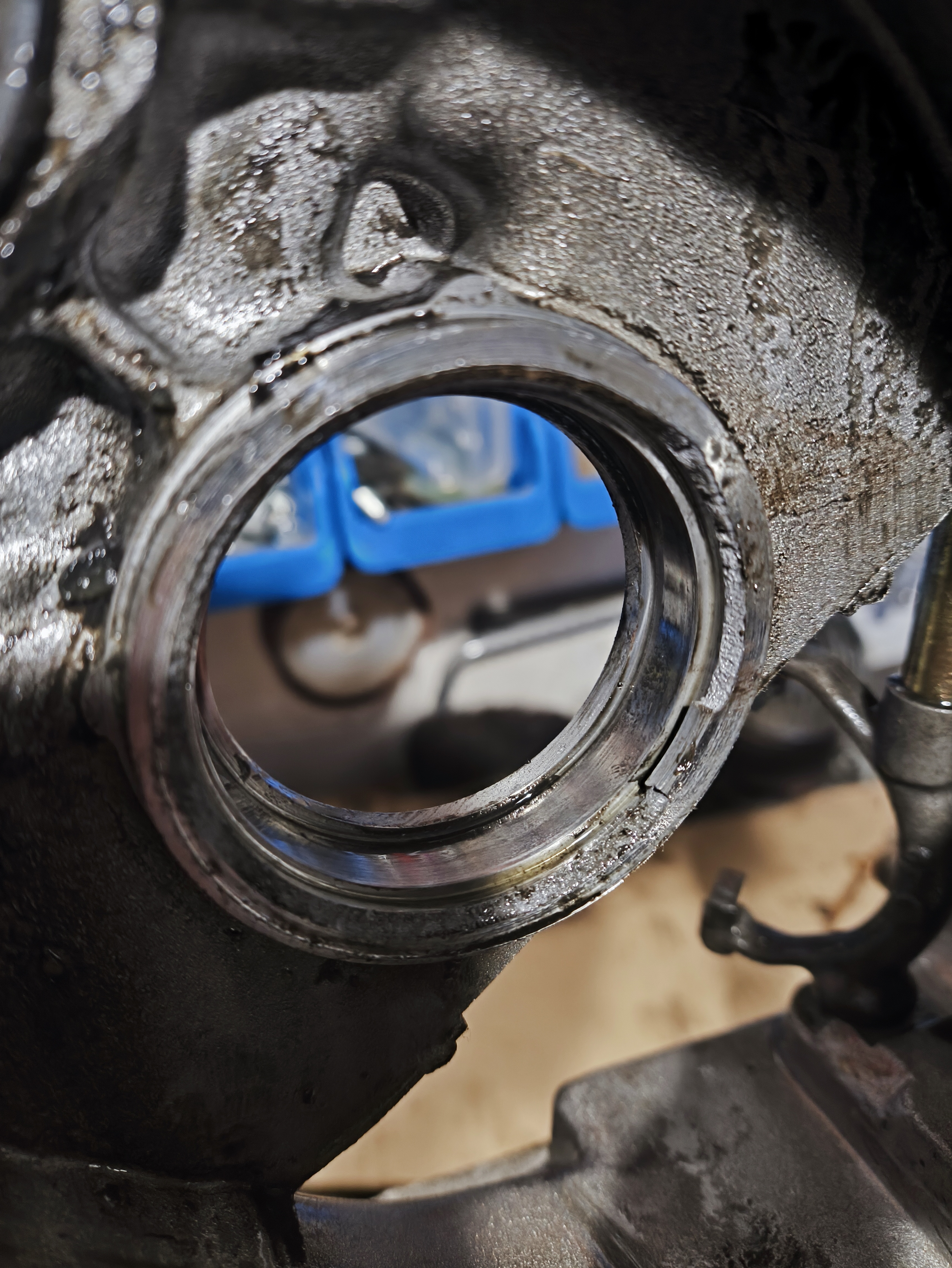 Sieht für mich eher aus wie der äußere Bund von der Nut des Sicheungsrings der da abgebrochen ist. Man kann doch Bruchkanten erkennen, oder sieht das nur so aus?
