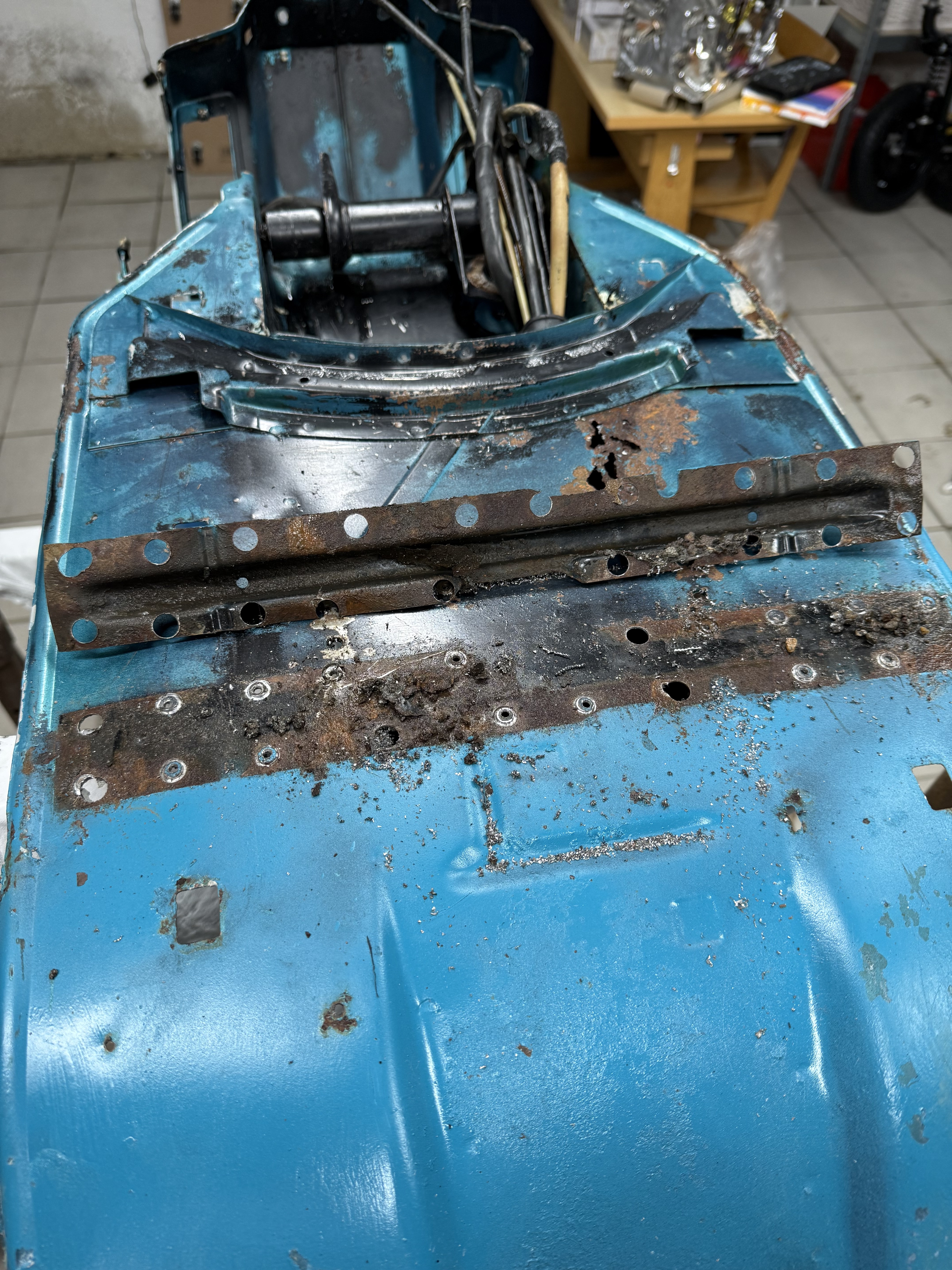Die Stoßdämpferaufnahne hat auch gelitten, das übliche mittige Rostnest zwischen den Blechen, nach oben durchgebrochen, da muss ich also auch ran. Wird doch was länger.