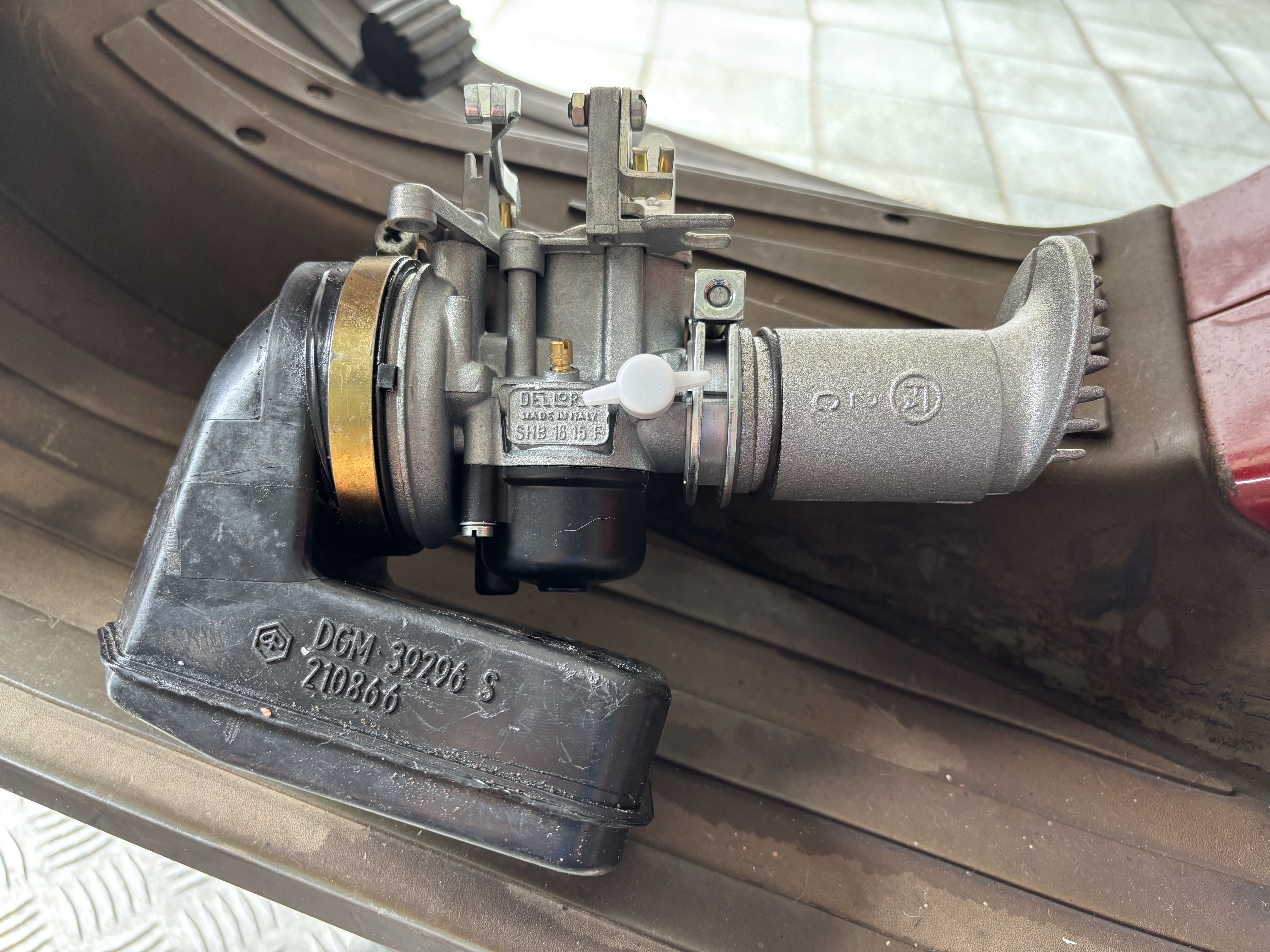 Gummibalg ist falsch herum, der Ring kommt weiter nach hinten und hält die Gusskappe auf dem Ansaugstutzen. Die Schelle für den Vergaser muss 90 Grad zu dir gedreht werden.