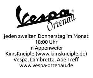 jeden zweiten Donnerstag im Monat findet ein Treff in Appenweier ab 18:00 Uhr in KimsKneiple (http://www.kimskneiple.de) an der Hauptstraße/B3 statt. Benachbart ist eine gute Eisdiele und wir nennen uns zwar Vespa Ortenau, doch sind Lambretta, APE und weitere gerne gesehen.
