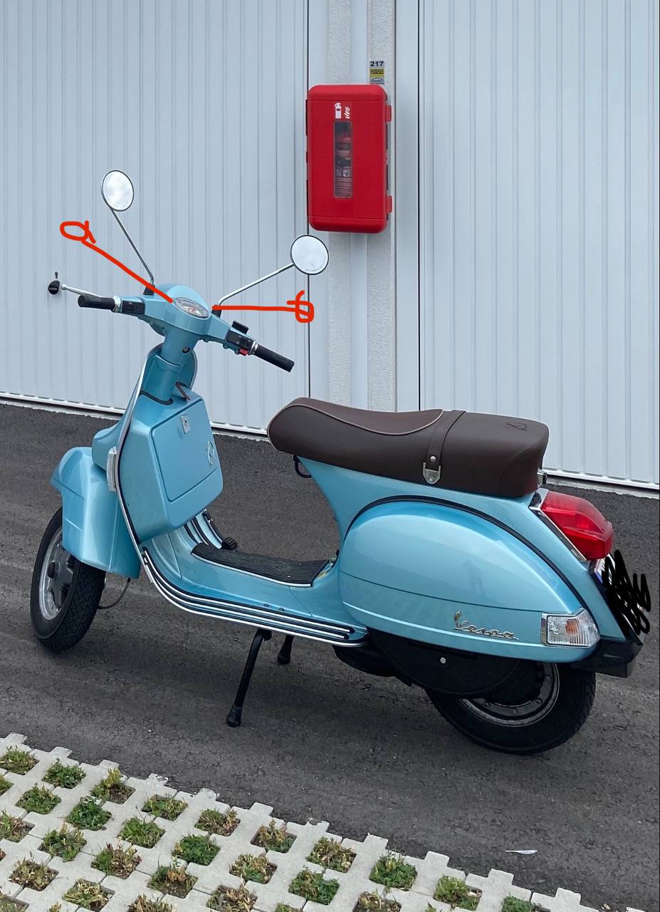Das einzige Manko ist meiner Meinung nach die Art der Spiegel. Abgesehen davon, dass sie wie Antennen aussehen, verdrehen sie sich auch oft während der Fahrt aufgrund von Vibrationen und Fahrtwind. Aus diesem Grund möchte ich - quasi zum 10 jährigen Geburtstag - einen neuen Spiegelsatz schenken. Anbei ein Bild meiner Vespa samt grob eingezeichneter Vorstellung der neuen Spiegel. Ich möchte sowohl links als auch rechts einen Spiegel haben, sie sollten Chrom/silber sein sodass es zur restlichen Optik passt. Sie sollten wesentlich niedriger sein als die jetzigen Spiegel, aber dennoch genug Sichtfeld bieten wenn möglich.