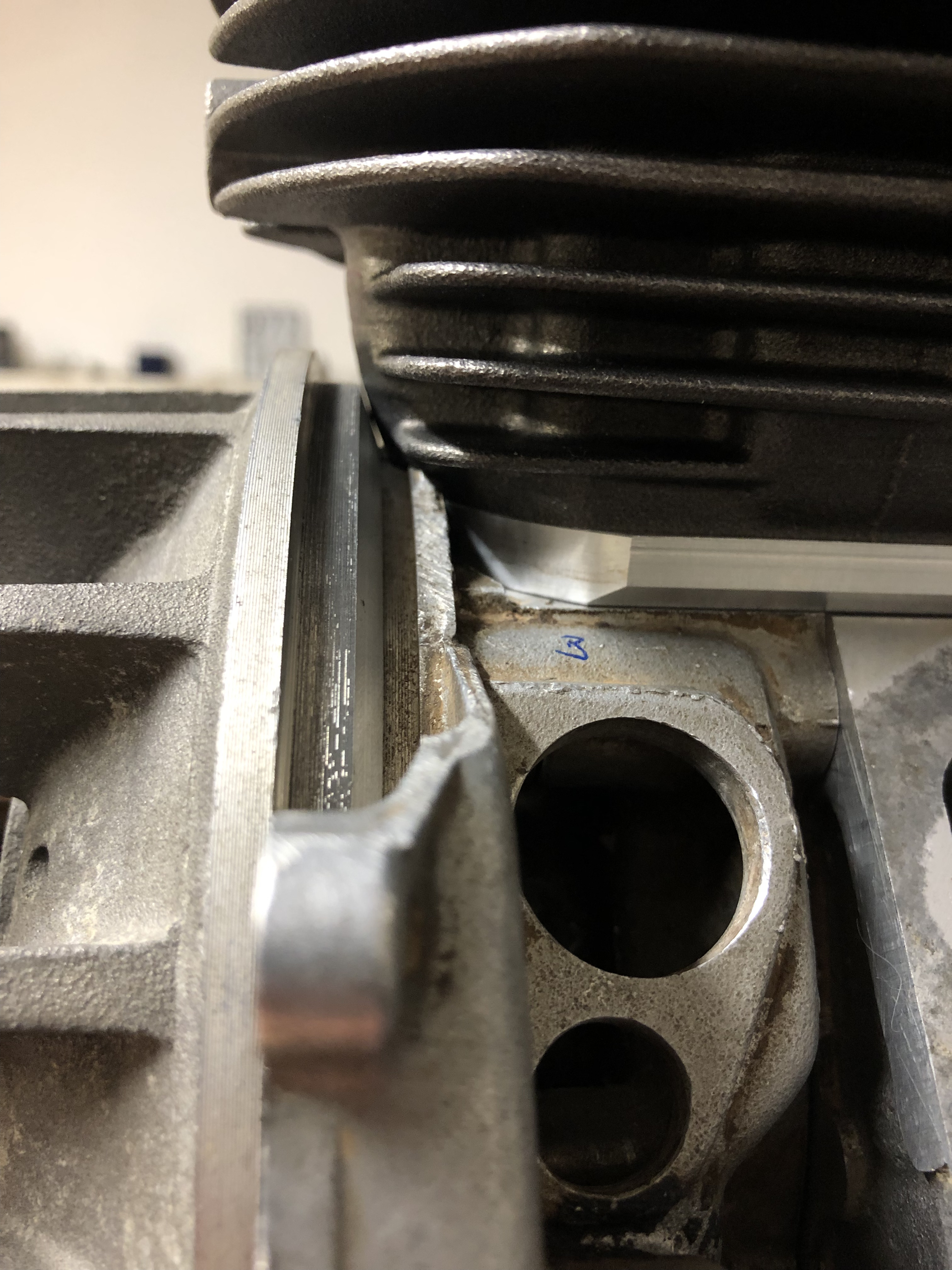 Der Kolbenboden schließt mit dieser Garnitur (105er Pleuel, 53 Hub) ungefähr bündig mit der Unterkante Auslaß ab, die Unterkante der Spülkanäle stehen etwas zurück im UT.