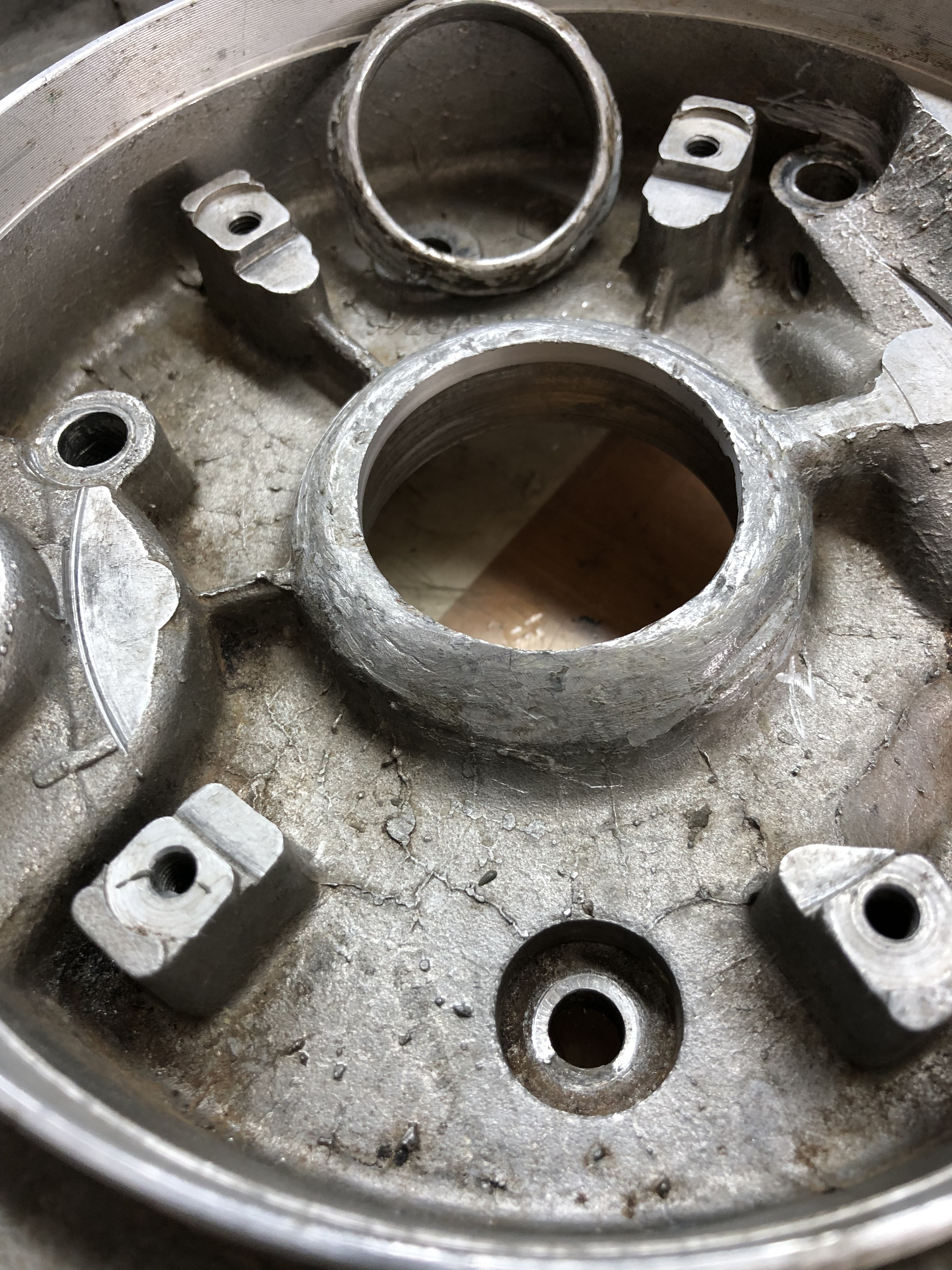 Aber diesen Trumpf behalte ich nur im Hinterkopf. An der polradseitigen Lagerung weiß ich ohnehin noch nicht genau, wie ich das ausführe. Der eigentlich recht solide und schön konzentrisch geklebte Ring mit dem Wedi-Sitz wird so eher nicht bleiben. (Der Schaden stammt noch von dem Vorbesitzer des Motors, von welchem Fantine ihn übernommen hat. Der Lagersitz ist nicht betroffen, eigentlich ein komischer Bruch...).