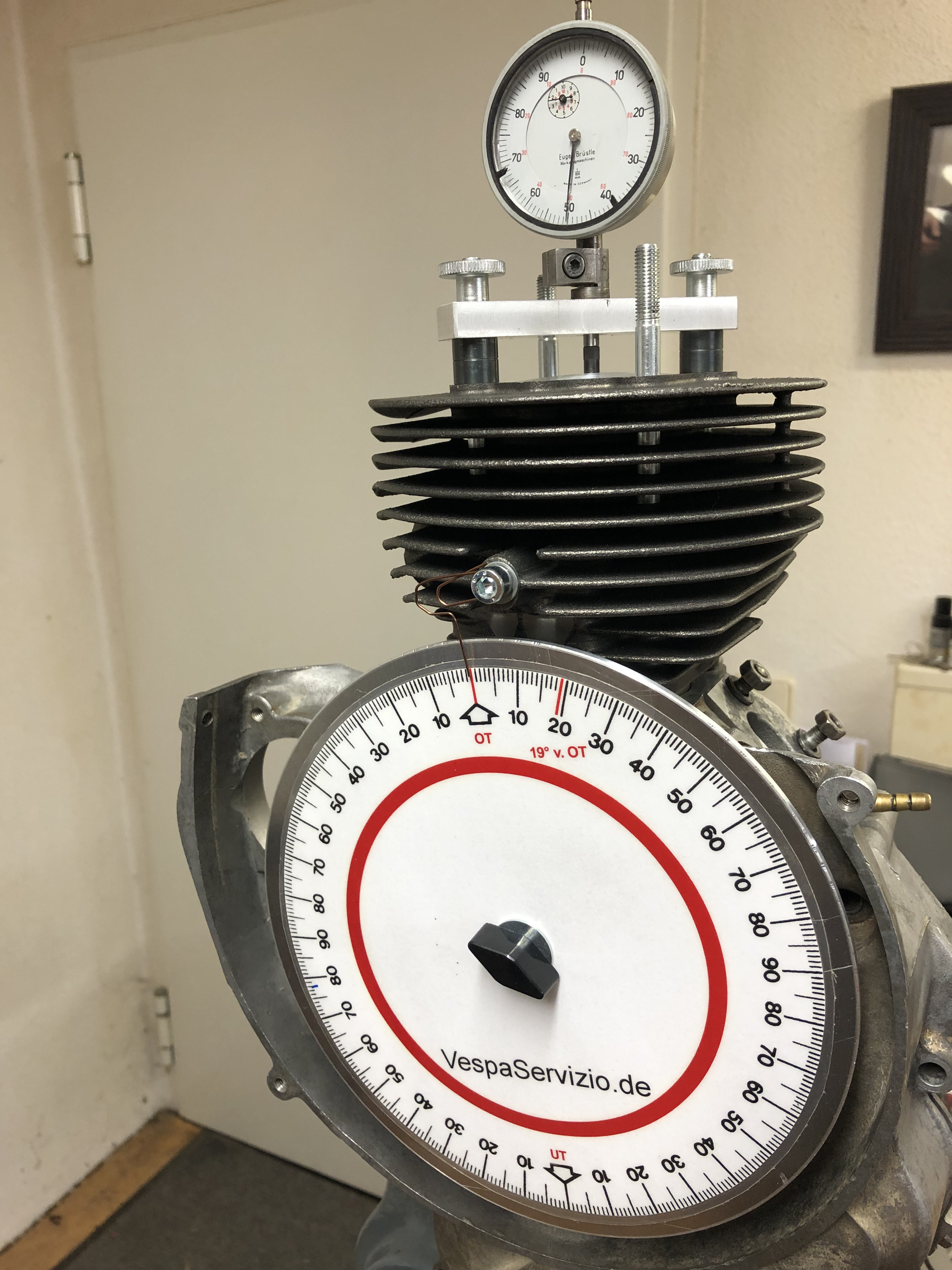 Der Kreisbogen ist konzentrisch zur Kurbelwelle. Meine Aluscheibe, die ich selber gedreht hatte, läuft mit kleinem Spalt dazu, nur die Skala ist etwas zu klein.