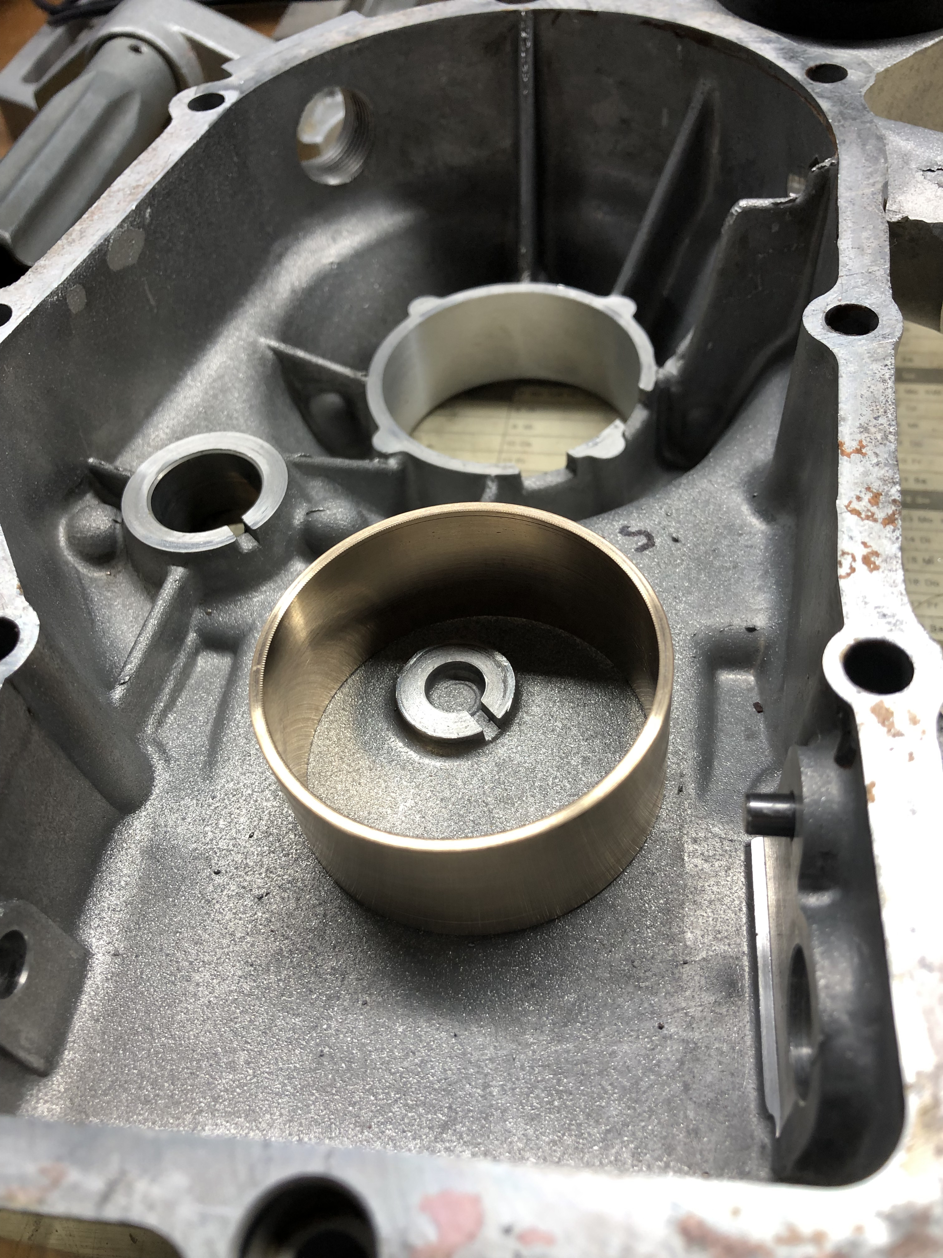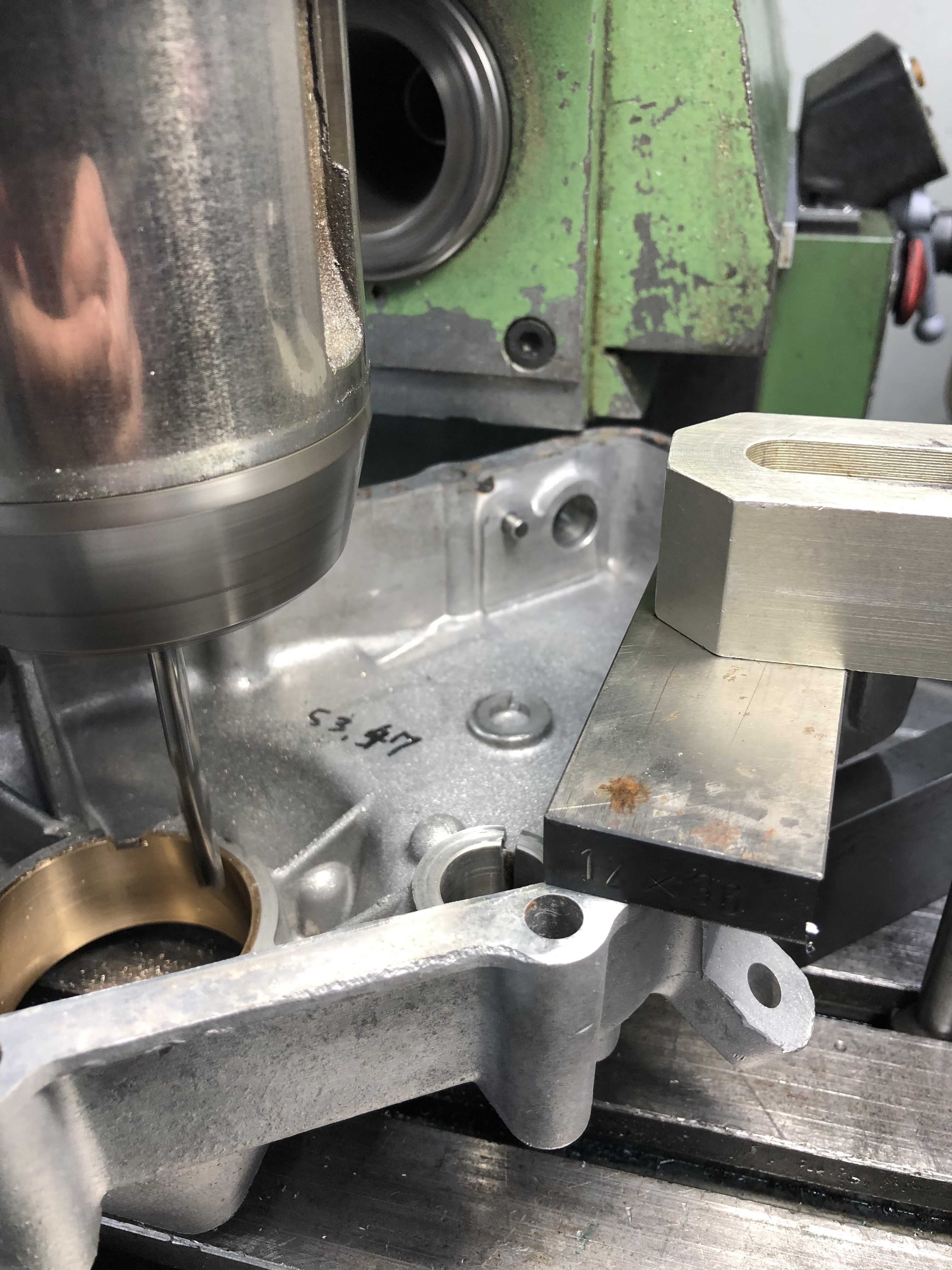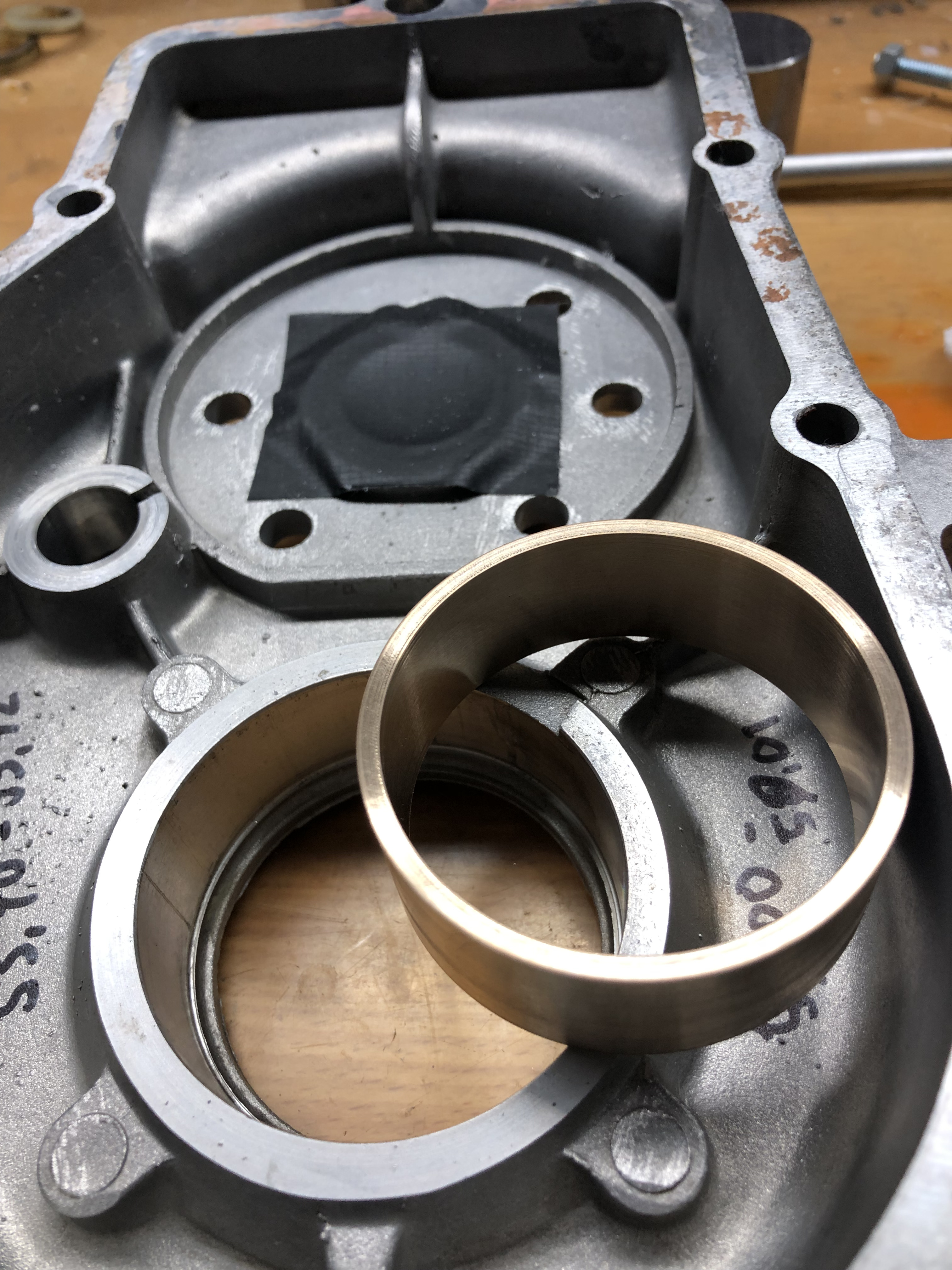 Die Lagerschale aus der Hälfte, die ab Werk eine hat, habe ich entfernt und die andere Hälfte habe ich mit dem Ausdrehkopf den Durchmesser für eine Bronzeschale mit 2 mm Wandung ausgespindelt.