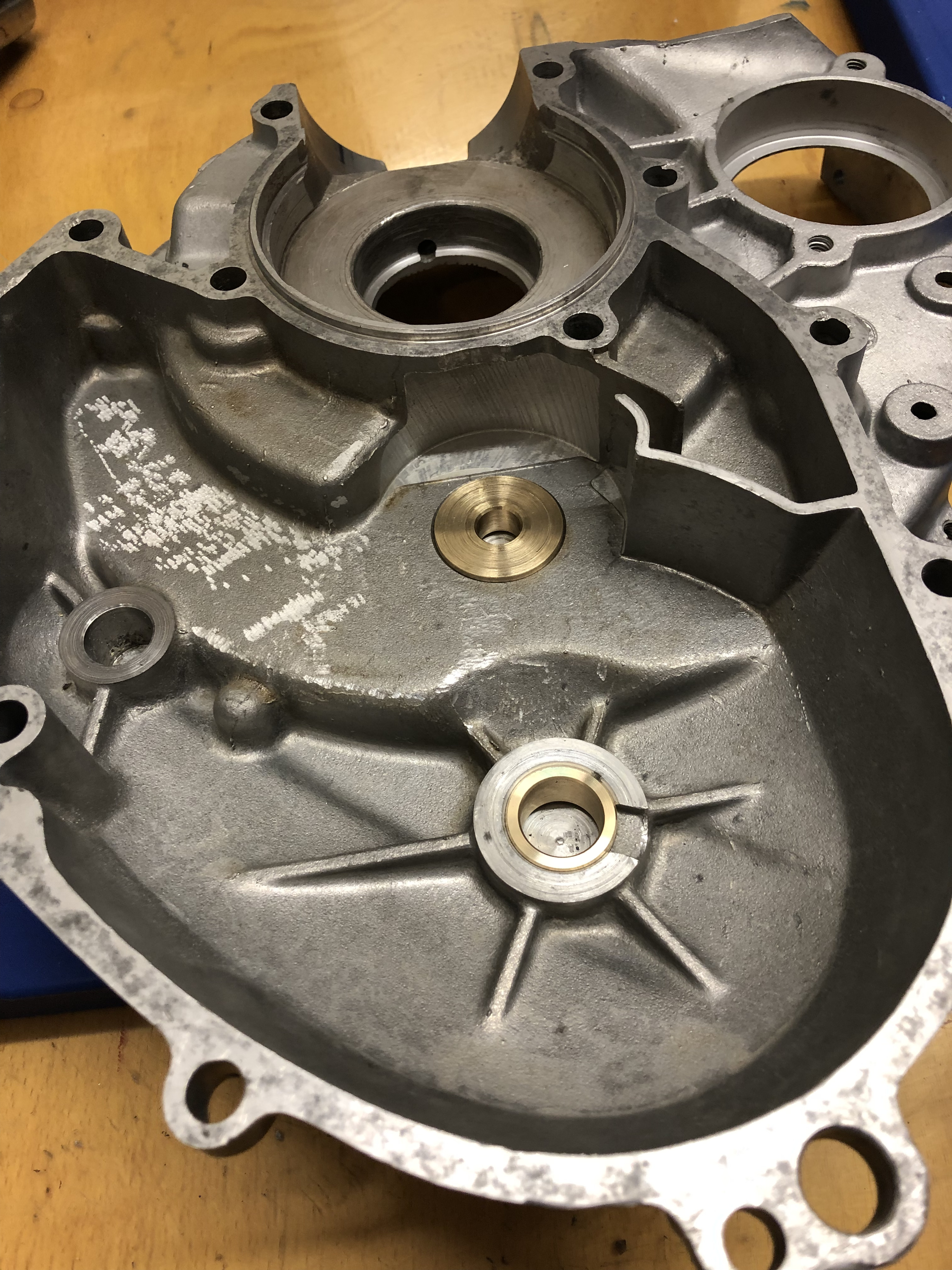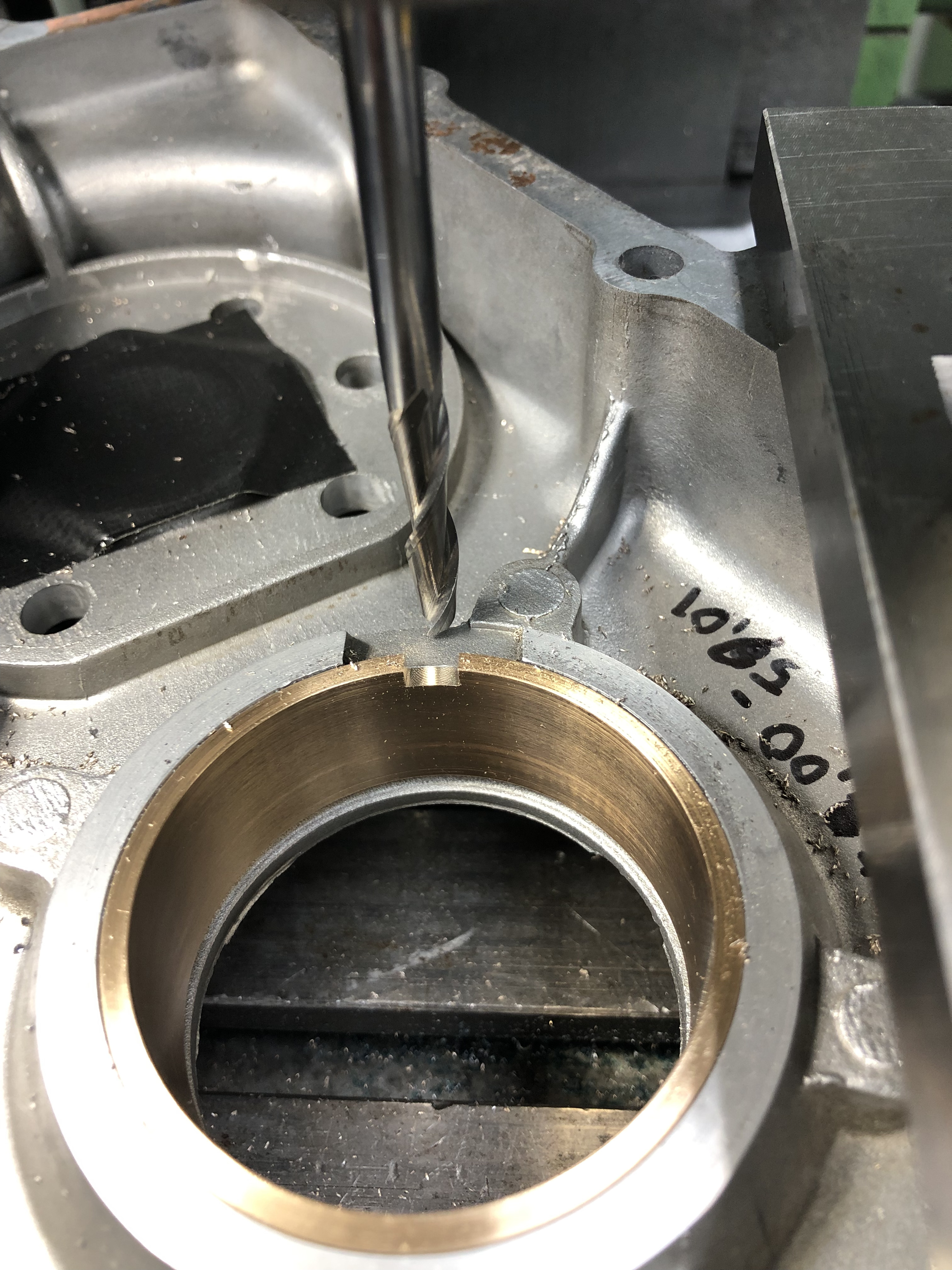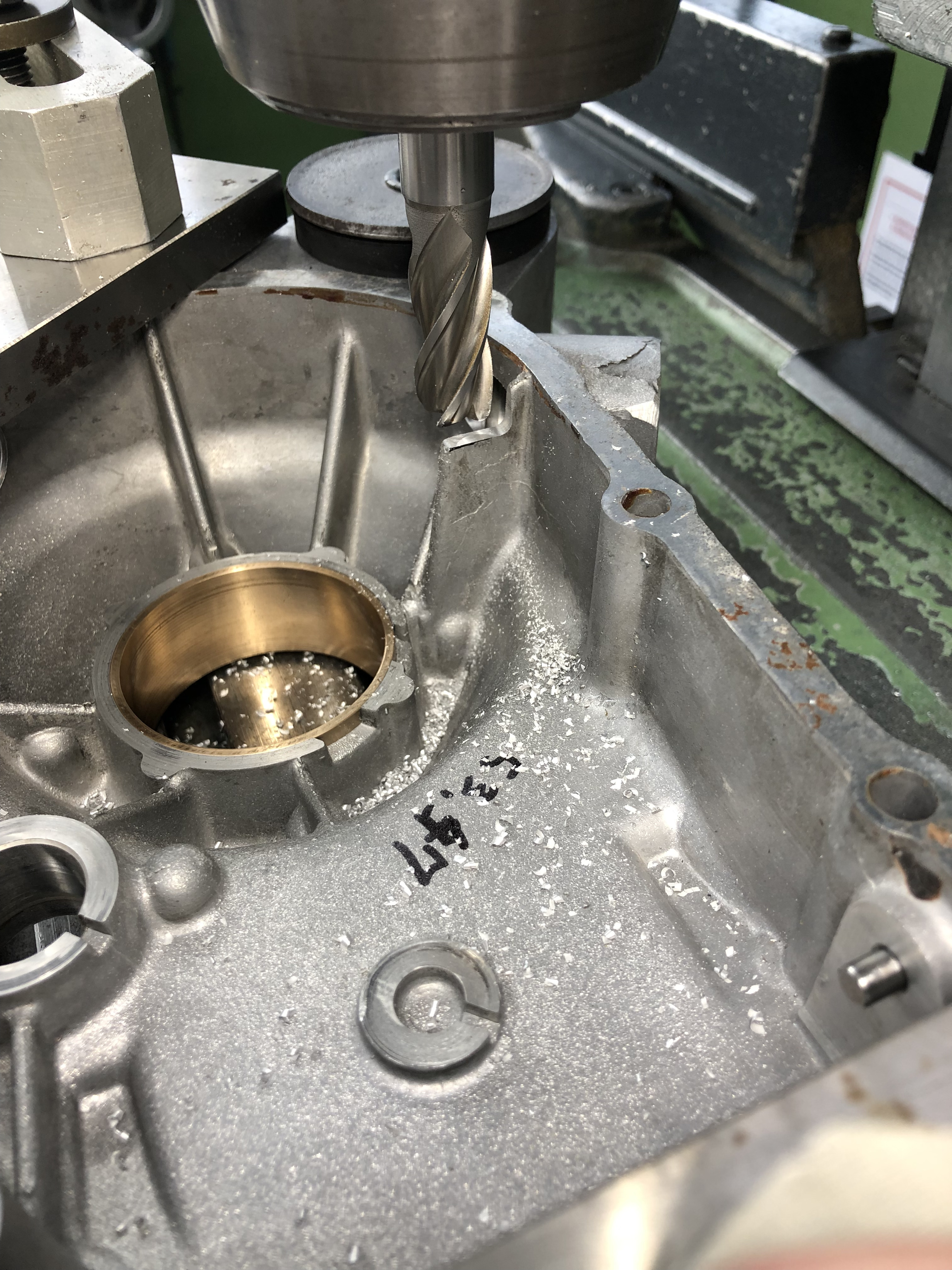 Die Lagerschale aus der Hälfte, die ab Werk eine hat, habe ich entfernt und die andere Hälfte habe ich mit dem Ausdrehkopf den Durchmesser für eine Bronzeschale mit 2 mm Wandung ausgespindelt.