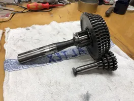 So, darf ich vorstellen, eine Ape-Hauptwelle mit einem nagelneuen PK-Getriebe plus nagelneuer Nebenwelle und nagelneuer DRT-Schaltklaue: