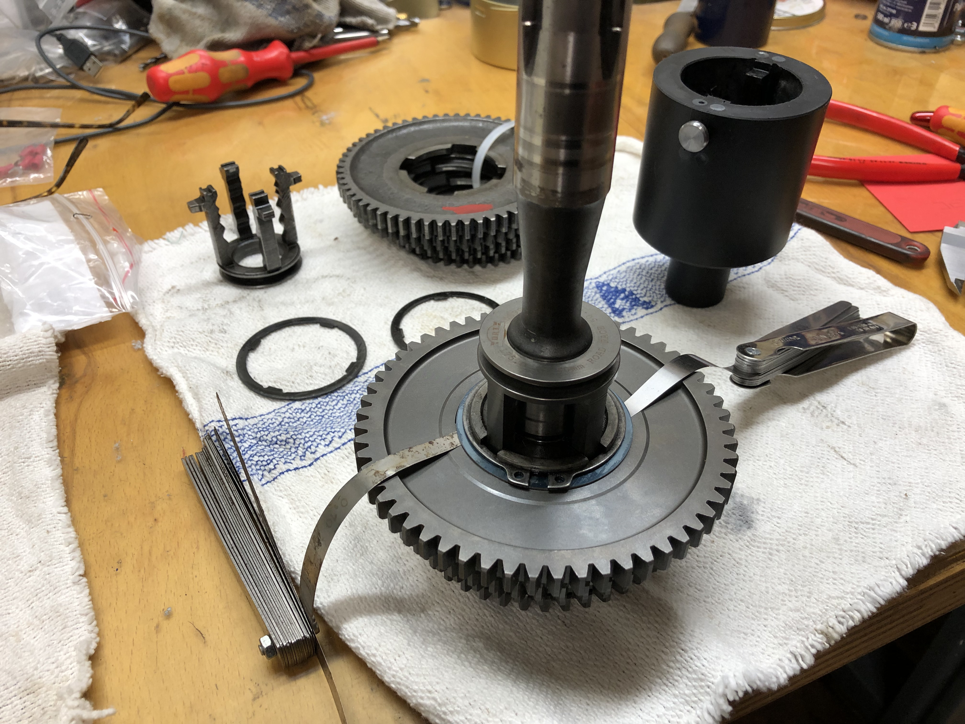 Ja, und dann habe ich gerade mal die Hauptwelle zerlegt und die DRT-Klaue montiert. Witzigerweise habe ich mit den der DRT beigelegten Scheiben ein strenges Zehntel Luft. Das werde ich so lassen und muß jetzt nicht dickere Seegerringe auf Maß schleifen.