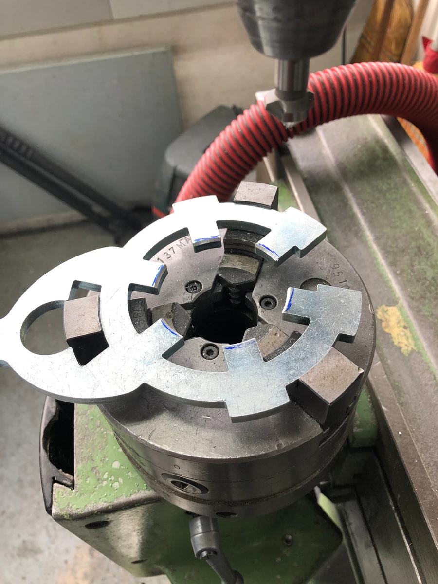 Nicht viel passiert. Habe gestern noch eine kleine Aufnahme gemacht, damit ich den vor 5 Jahren gelaserten Krümmerflansch, der die Verbindung zum Sito geben wird, ebenfalls auf die 32 ausdrehen kann und kurz auf der Diskus überschliffen: