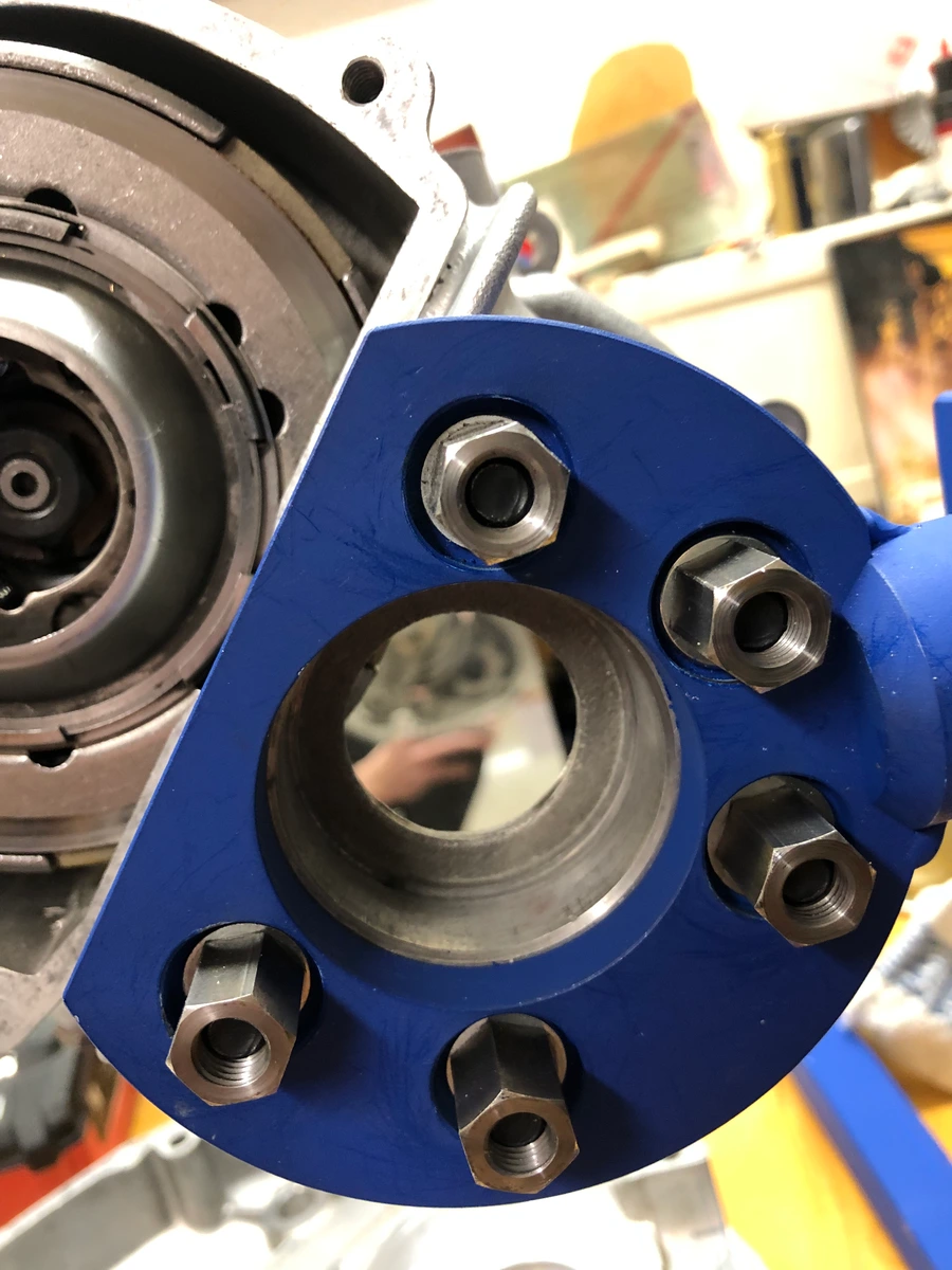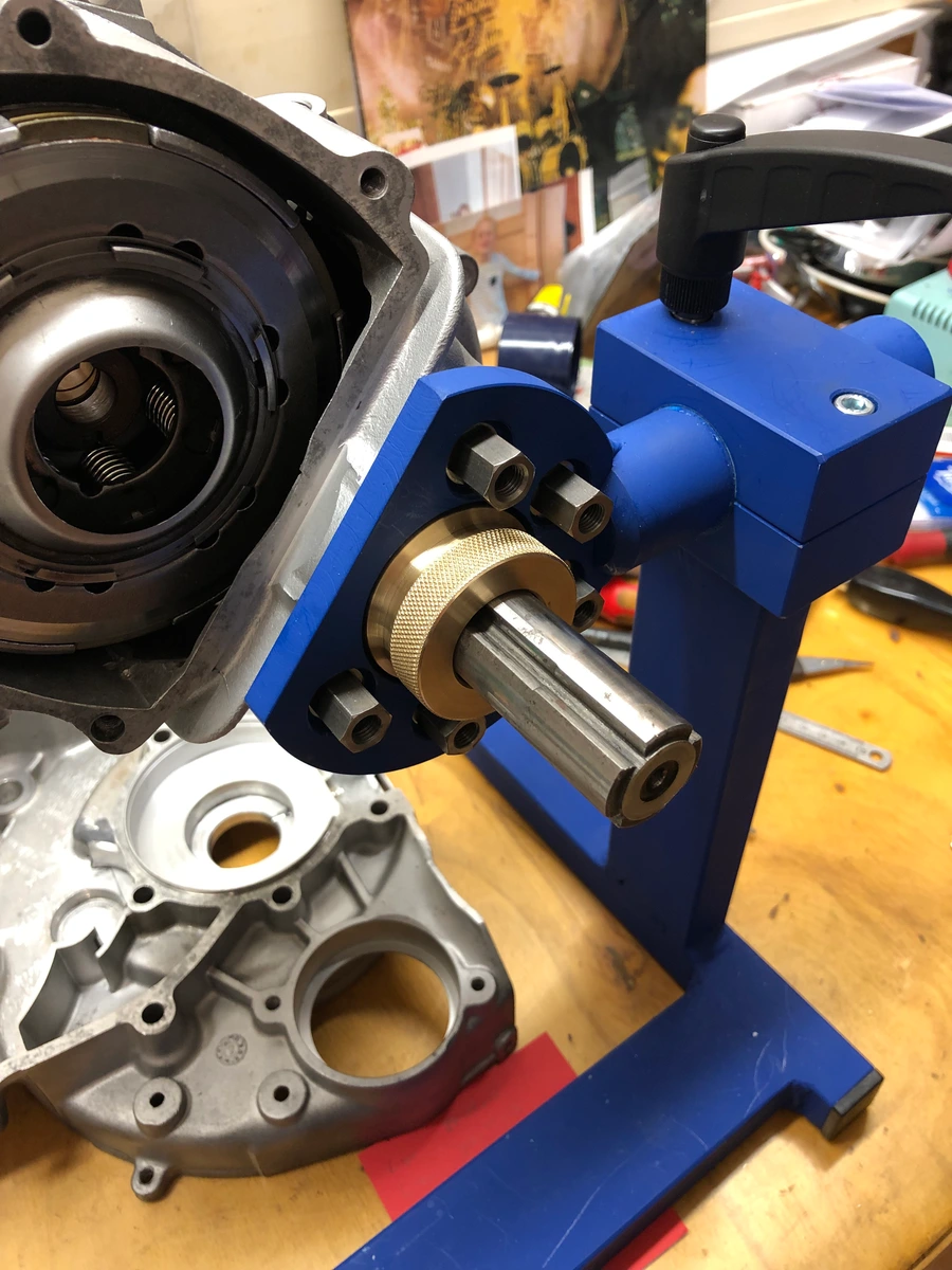 Deshalb habe ich mir mein ein Haltewerkzeug gekauft und so modifiziert, daß es auch in den Motor paßt und mit den inneren Klauen den Kupplungskorb halten kann.