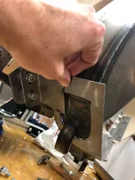 Mit den Pufferdummys in die Mitte der Langlöcher geschraubt konnte ich deren Umfang am Halteblech anzeichnen, das ich mit Gripzangen am Motorträger befestigt hatte: