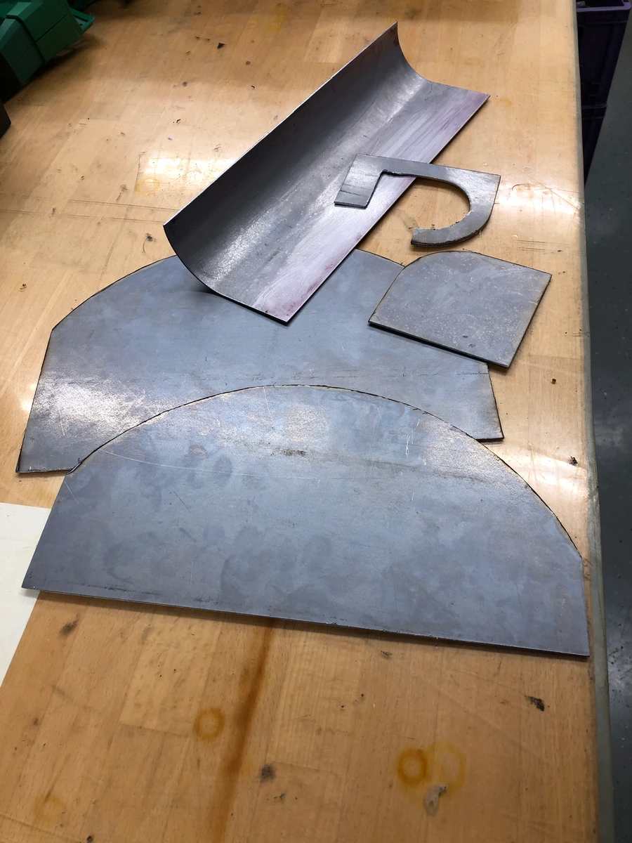 Dann habe ich letztlich nach alter Sitte ganz simpel von den Blechen eine 2D-Ableitung gemacht, es ausgedruckt 1:1 und dann mit Sprühkleber auf 1,5er Blech geklebt. Danach dann mit Schlagschere, Knabber und zum Schluß Bandschleifer an die Kontur gebracht.