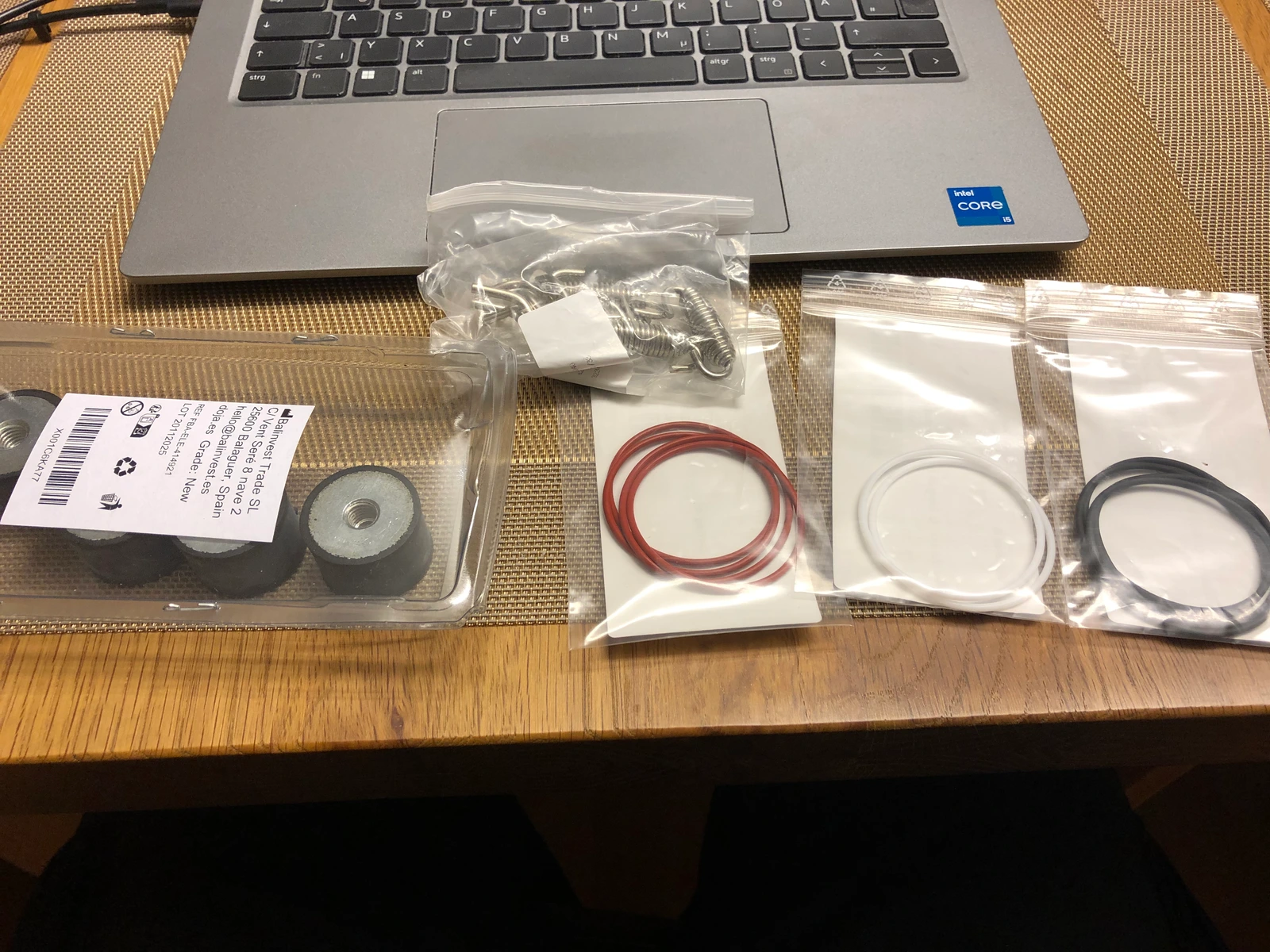 Die O-Ringe in den verschiedenen Materialien, der weiße ist der PTFE. Die jeweils 4 Gummipuffer und Auspuffedern inklusive Schweißhaken.
