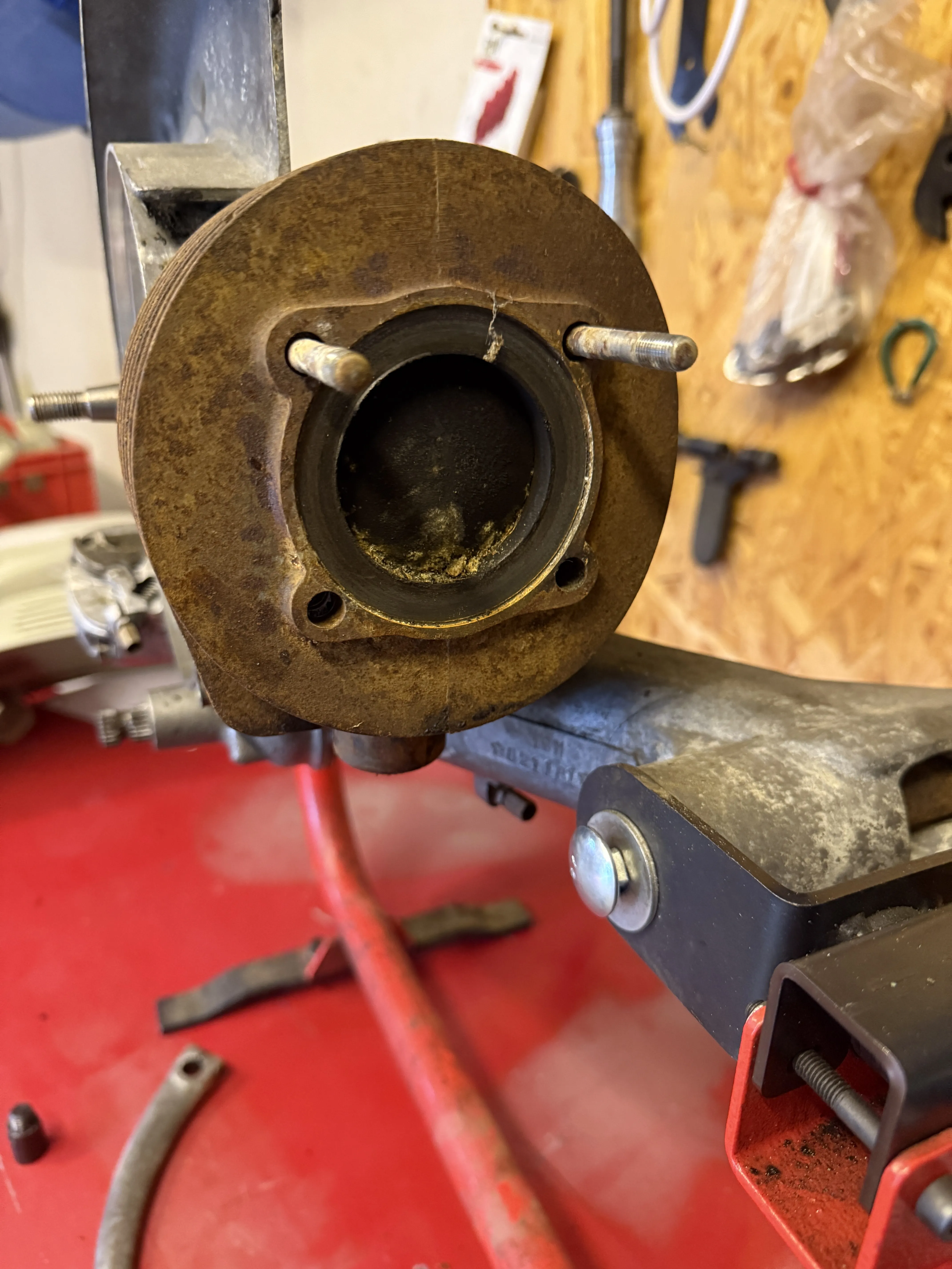 Jetzt steht der Motor erstmal hochkant und ich gucke mal, ob WD40 was bewirkt. Dann ein bisschen Wärme und noch mal versuchen.