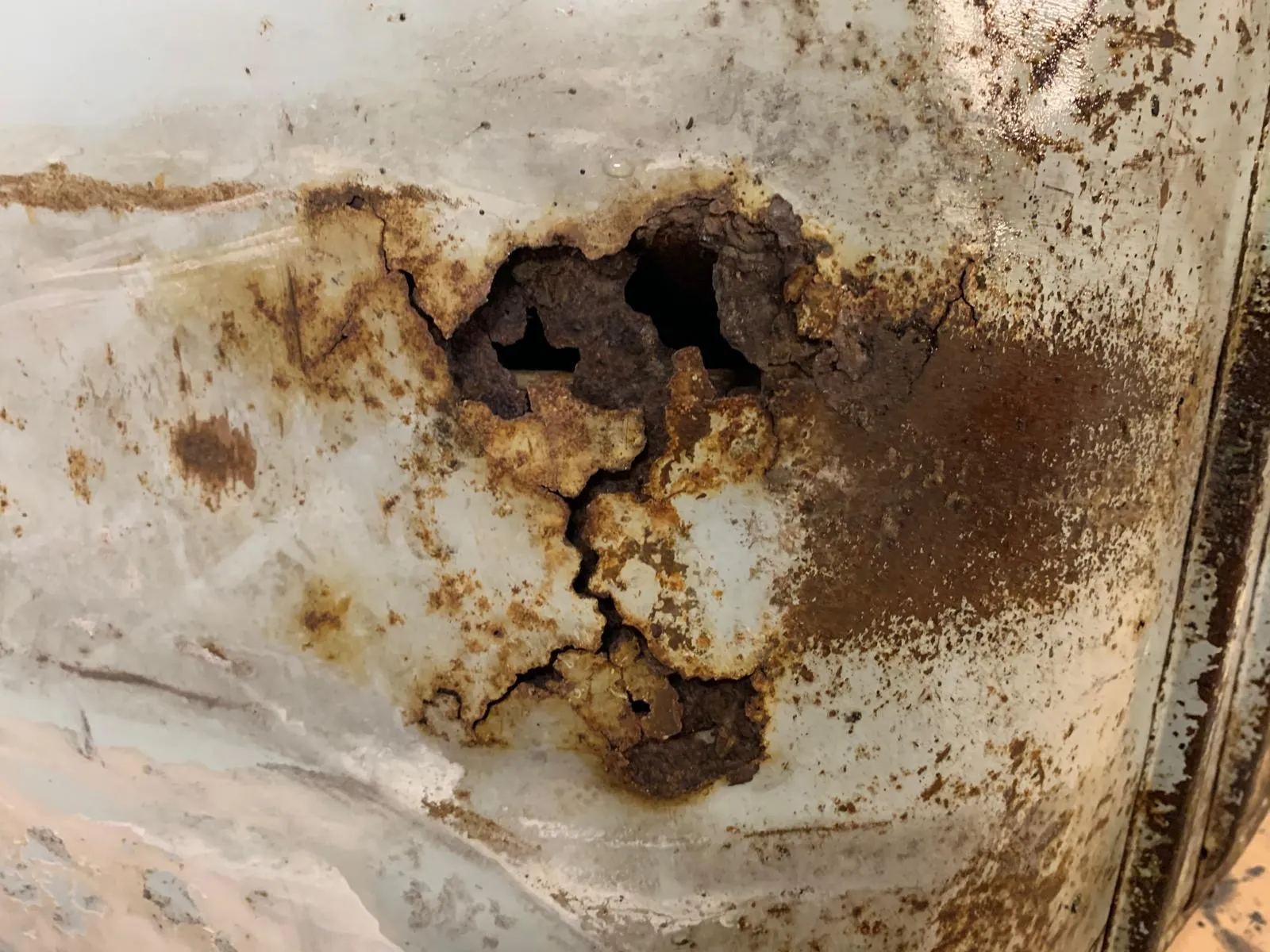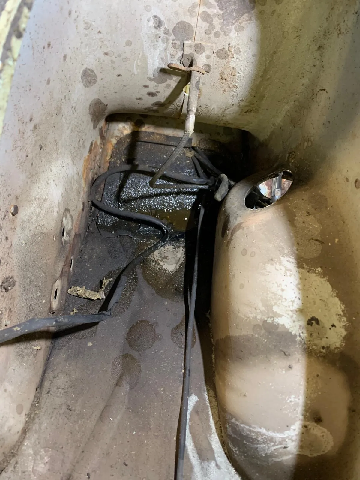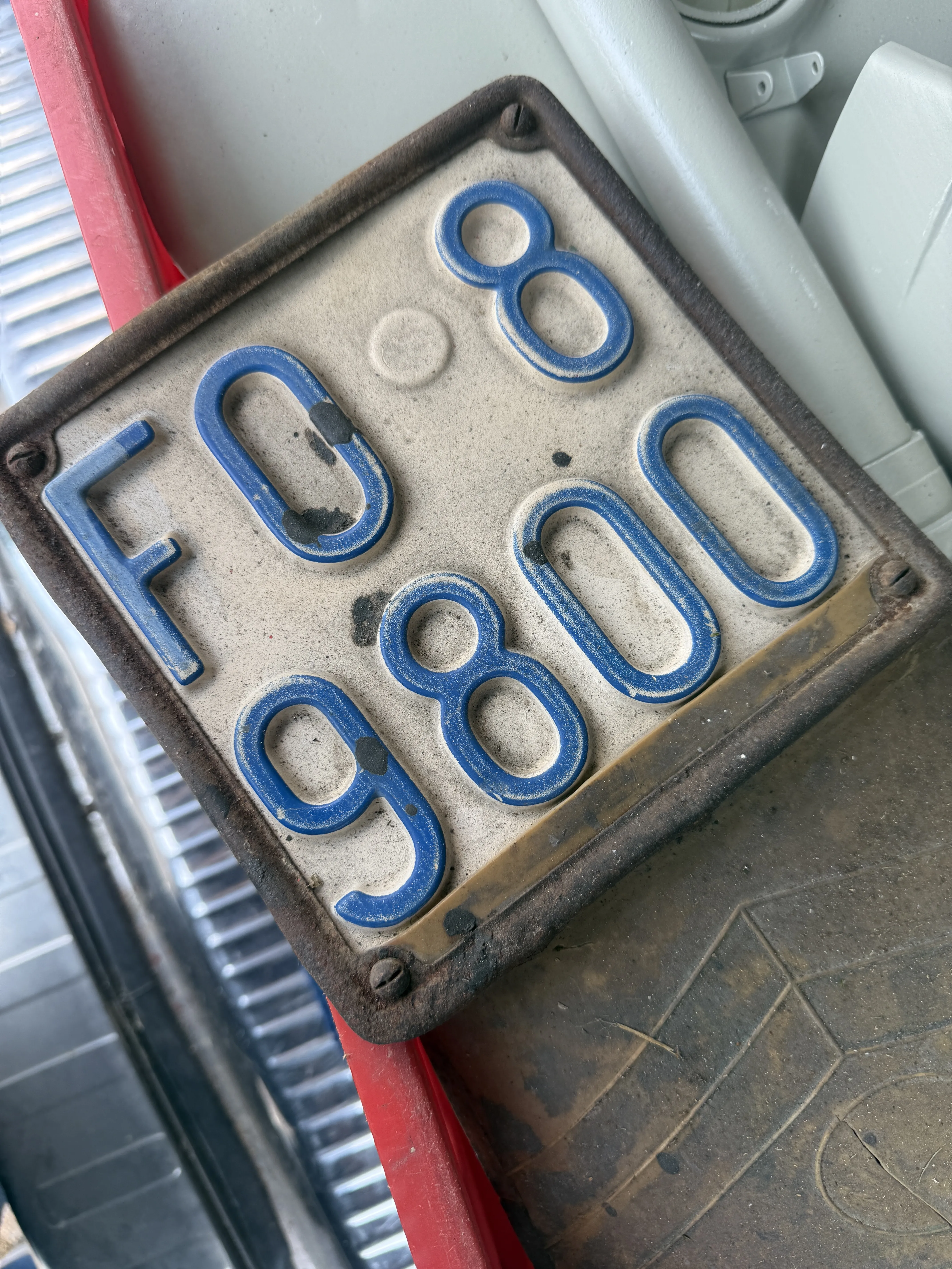 Die Entscheidung, ob es ein O Lack Projekt wird, wurde mir abgenommen. Da im Beinschild und Trittblech ein paar Löcher klafften, wurde das Blech bereits vorab durch einen Karosseriebauer (ein Bekannter des Vorbesitzers) ersetzt, gestrahlt und das meiste auch schon grundiert.
