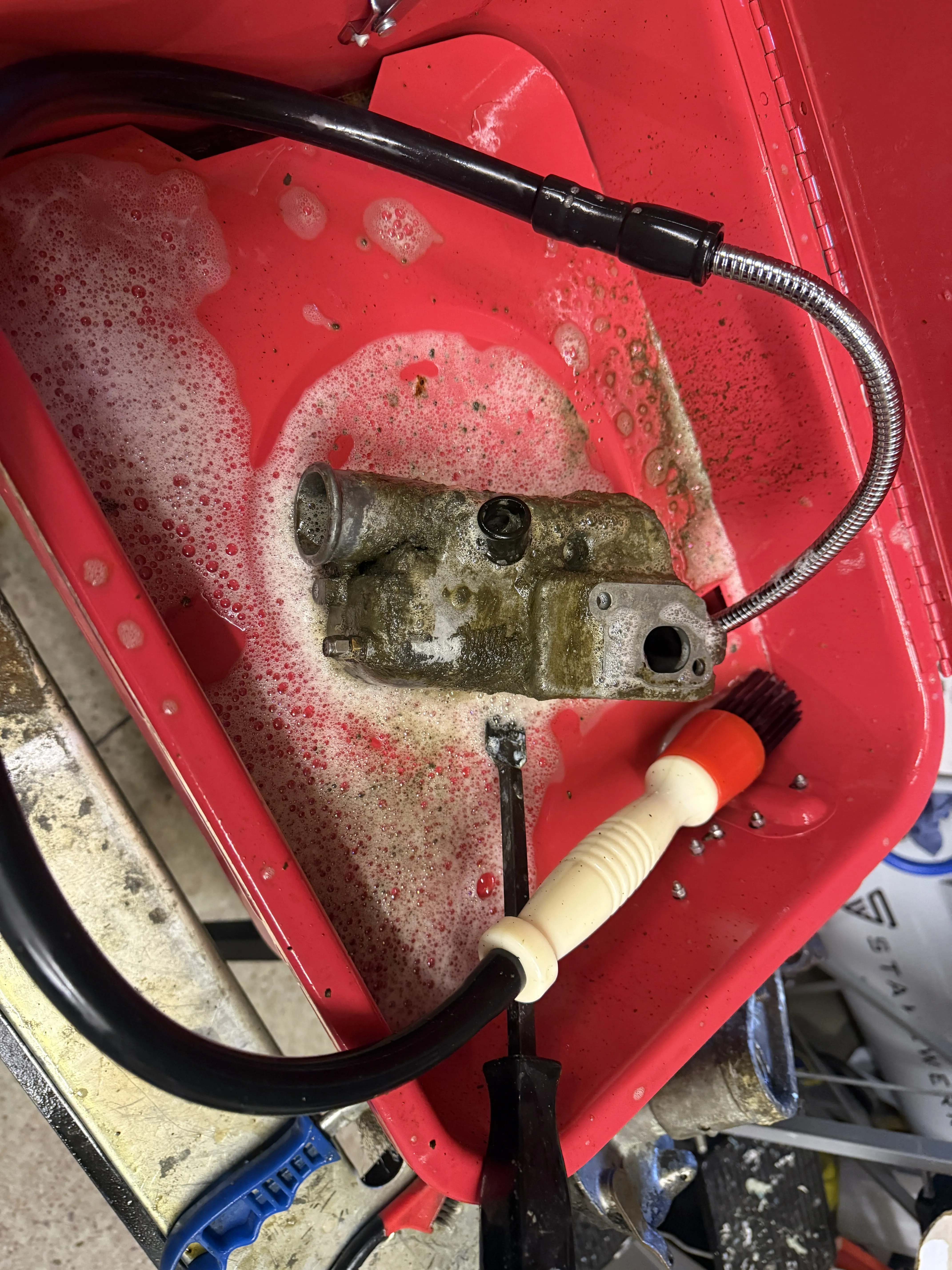 Ein paar andere Teile, die ich ja schon im Teilewaschapparat sauber gemacht hatte, hab ich noch mal ne Stunde bei 55 Grad im Ultraschallreiniger gebadet. Wahnsinn, was sich da noch ein Dreck gelöst hatte.