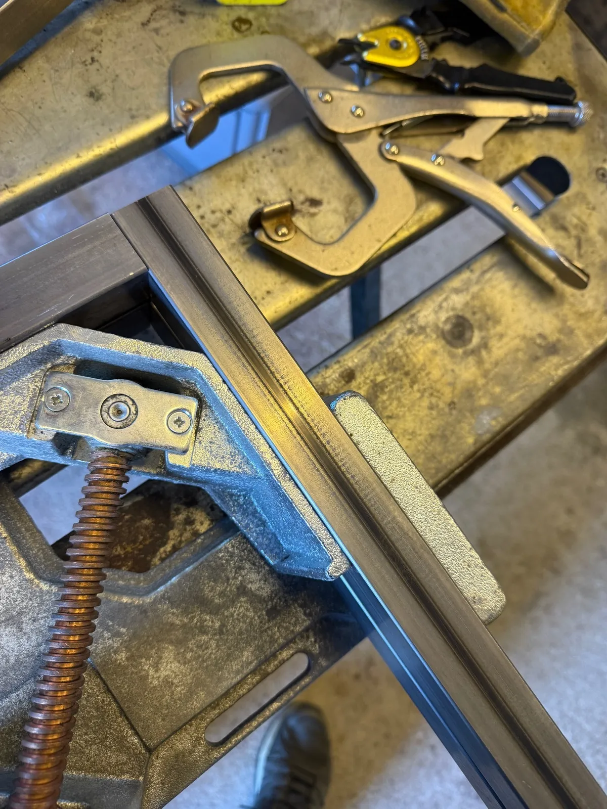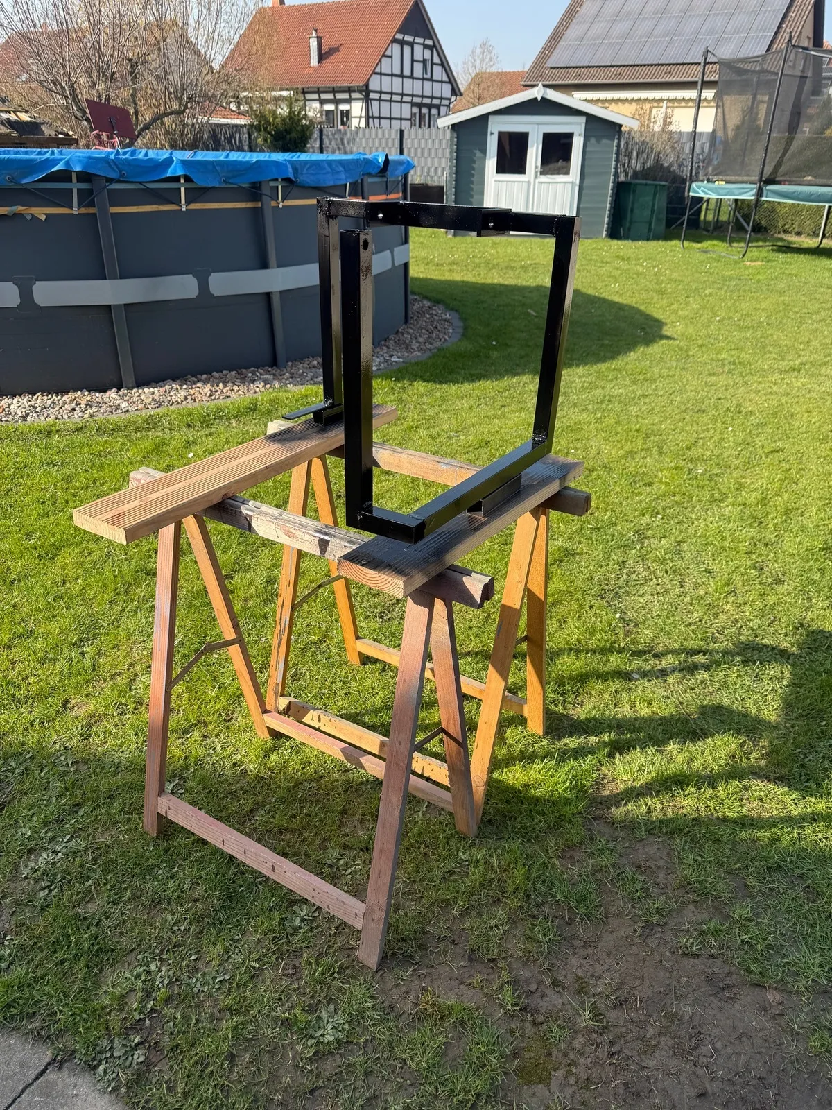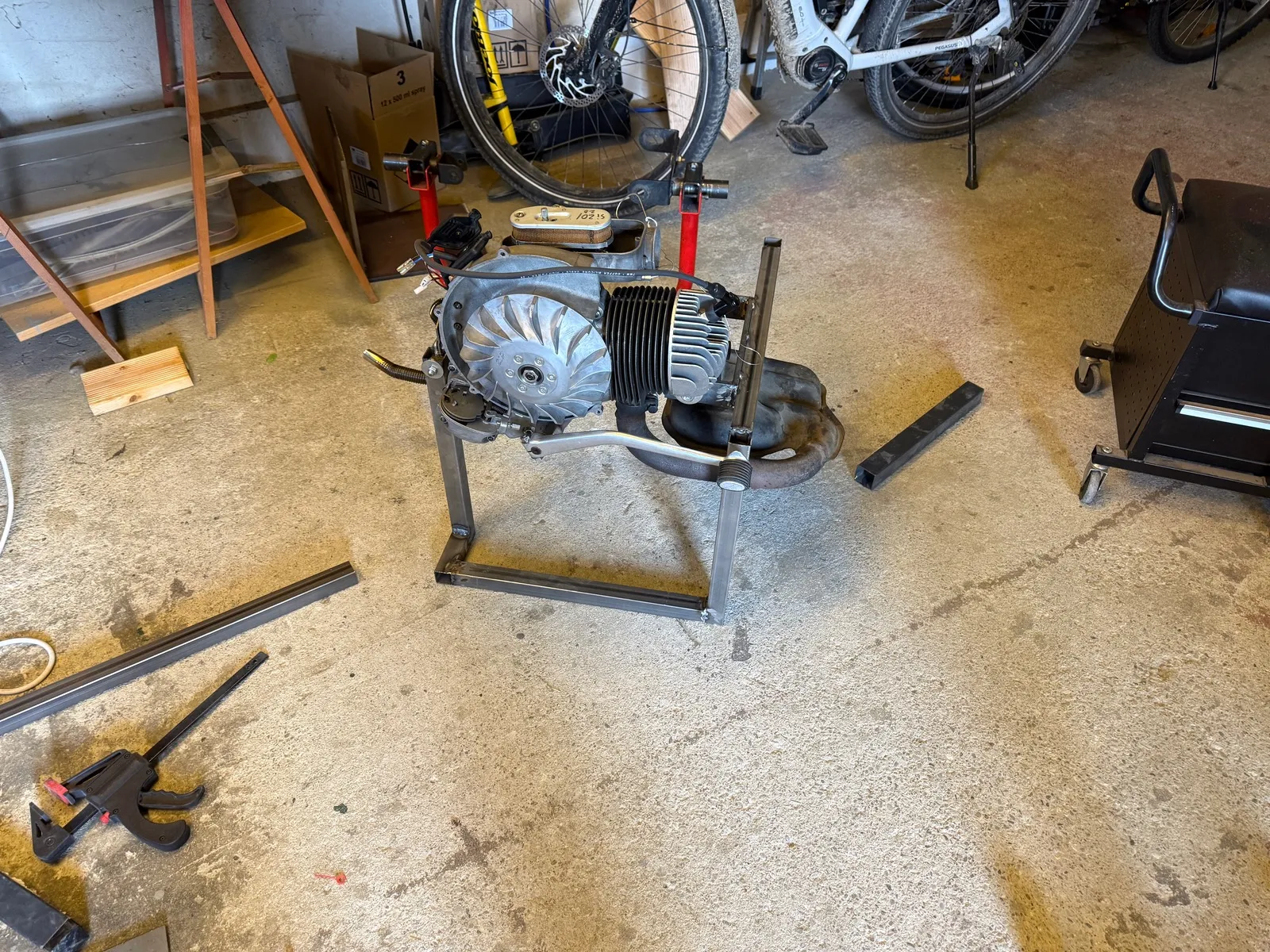 • Da mein Motorständer ja noch belegt ist, habe ich mir heute einen neuen zusammengebraten. Übelste Schweißnähte, aber ist stabil. Ziel war, den Auspuff vernünftig drunterpacken zu können. Das klappt ja bei den meisten käuflichen nicht.