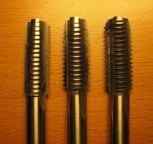 Mit den drei Gewindeschneider ist das wirklich ganz einfach, das kann sogar ich :] ... Man fängt einfach von links nach rechts an... und am besten nur mit der Hand, niemals mit der Maschiene oder so... Es gibt dafür einen besonderen Griff, in den man die Schneider einspannt... Es gibt die eigentlich in allen Größen, ich hab nur mal die größten rausgesucht (M11), da kann man den Unterschied zwischen den Dingern am besten sehen... Das Spezialöl hab ich bei Alu noch nie, jedoch trotzdem alle drei Schneider benutzt... das macht immer noch das beste Ergebnis... den Preis für so n Set kann ich dir allerdings nicht sagen, bei uns liegen die schon jahrelang in der Garage...