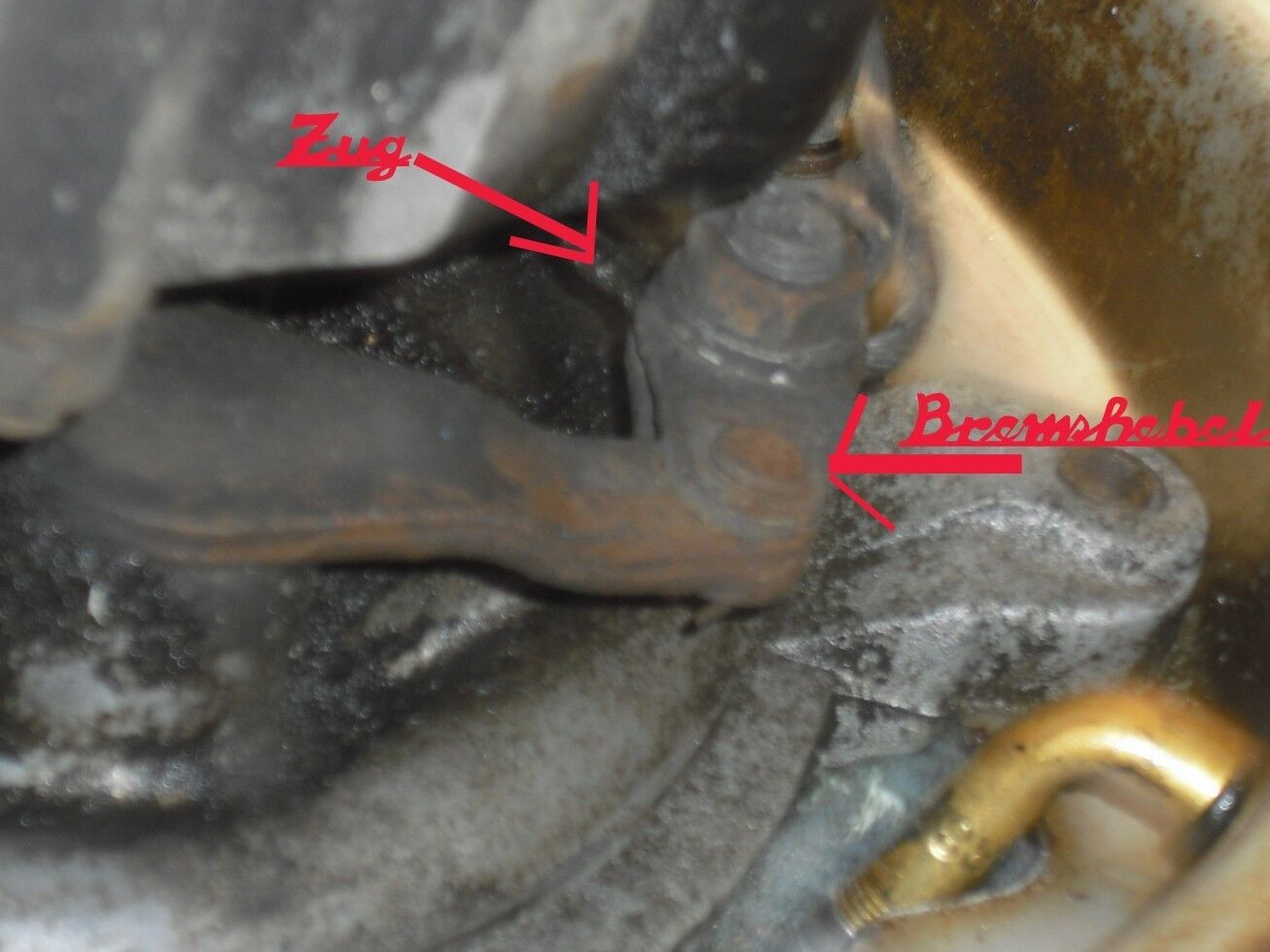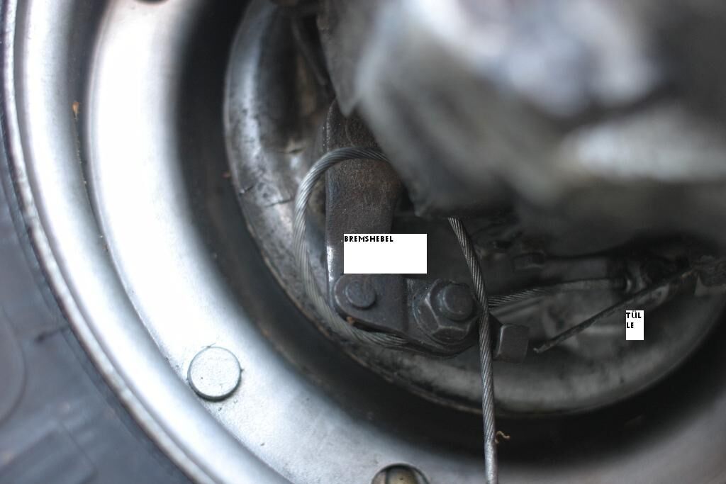 der hintere Bremszug ist mit einer klemme an einem Hebel festgemacht der dann in die bremsankerplatte reingeht und dort die backen innen auseinanderdrückt: Grobeinstellung