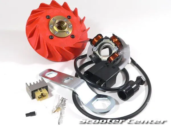 Bei der Vespatronic-Zündung vom Scooter-Center ist 'ne neue Lima dabei:Die Leistung der Lichtmaschine liegt bei 90W und die Versorgung des Bordnetzes erfolgt wahlweise mit AC oder DC.