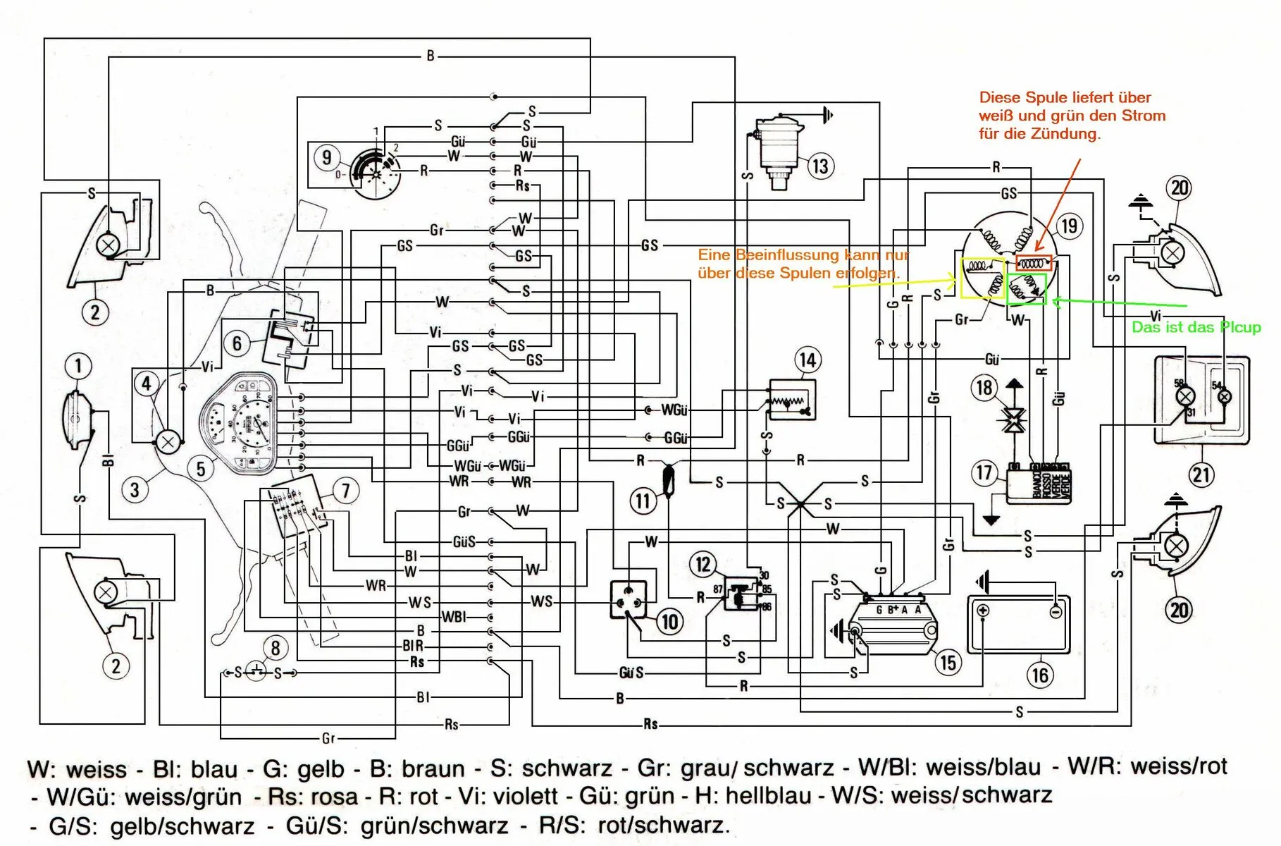 Allso, ich hab mal im Plan rumgemalt. Das Rote ist die Spule die den Strom für die Zündung liefert, die muß OK sein. Das Grüne ist das PICUP muß wohl auch OK sein. Die Störung muß durch das gelb eingezeichnete Spulenpaar kommen. Die sind über das Graue Kabel mit dem Regeler verbunden. Soweit so gut. Das obere Spulenpaar ist über rot mit der Sicherung verbunden, und weiter über das Zündschloß mit dem Rest. Die andere Seite der Sicherung geht über den Magnetschalter ( 12) zur Batterie. Der Magnetschalter ist, anders als gezeichnet, offen. Der schließt nur beim Starten. Das zweite Kabel dieser Spulen, grau, geht auf den Spannungsregeler Punkt "A". Was jetzt kommt sind Vermutungen. Entweder hat der Spannungsregeler ne Macke oder in Elektrik ist irgentwo ein Fehler. Eine Möglichkeit, in der Mitte des Generators der Punkt, wo die Spulen rot und gelb miteinander verbunden sind ???