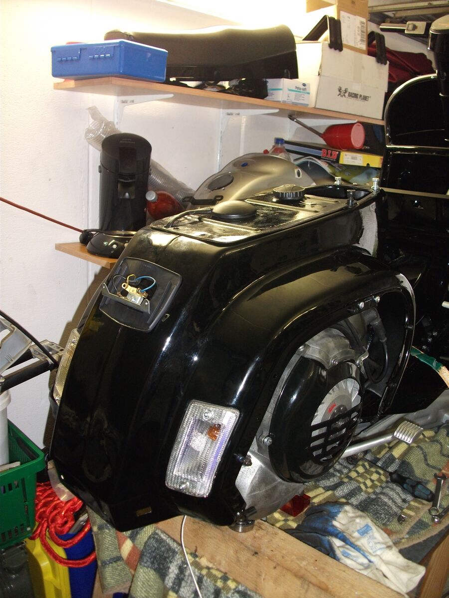 die Teile sind nun alle dran. Die Sitzbank ist fest, die Dämpfer sind drin. Jetzt nur noch Felgen Verchromen lassen (Bruder) und die Restlichen Teile bestellen (nach´m Urlaub).