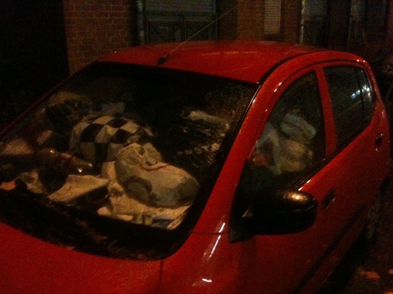Da war kein platz mehr drin. Der müll lag an allen scheiben an. War bis unterm himmel zugemüllt. Habe ich noch nie gesehen so ein zugemülltes auto...